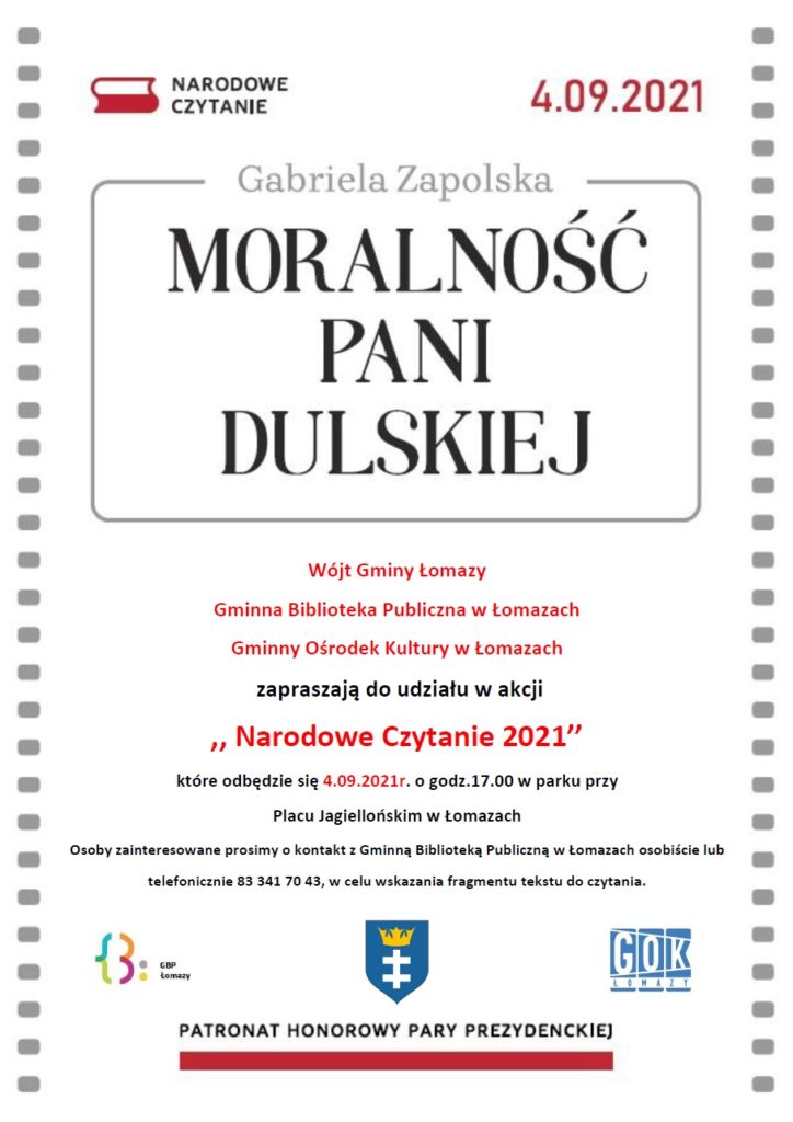 Wójt Gminy Łomazy, Gminna Biblioteka Publiczna i Gminny Ośrodek Kultury w Łomazach zapraszają na akcję Narodowe Czytanie 2021. Miłośnicy literatury zbiorą się, aby przeczytać utwór Gabrieli Zapolskiej “Moralność pani Dulskiej”.