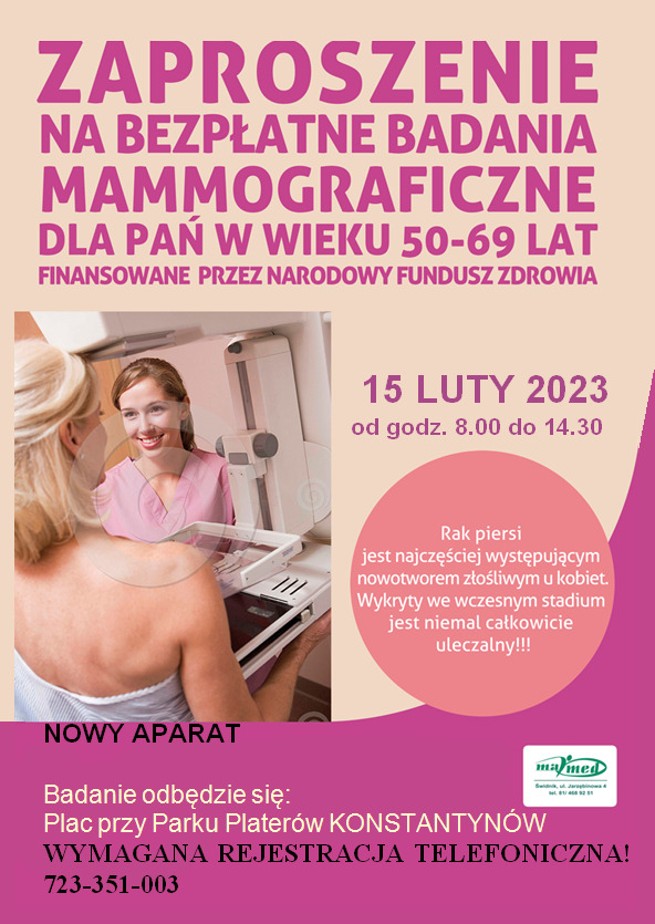 W dniu 15 lutego (środa) w godzinach od 8:00 do 14:30, na placu przy Pałacu Platerów w Konstantynowie, będzie można wykonać badanie mammograficzne. Oferta skierowana jest do Pań w wieku 50-69 lat. Badanie jest bezpłatne, ale wymaga wcześniejszej rejestracji.
