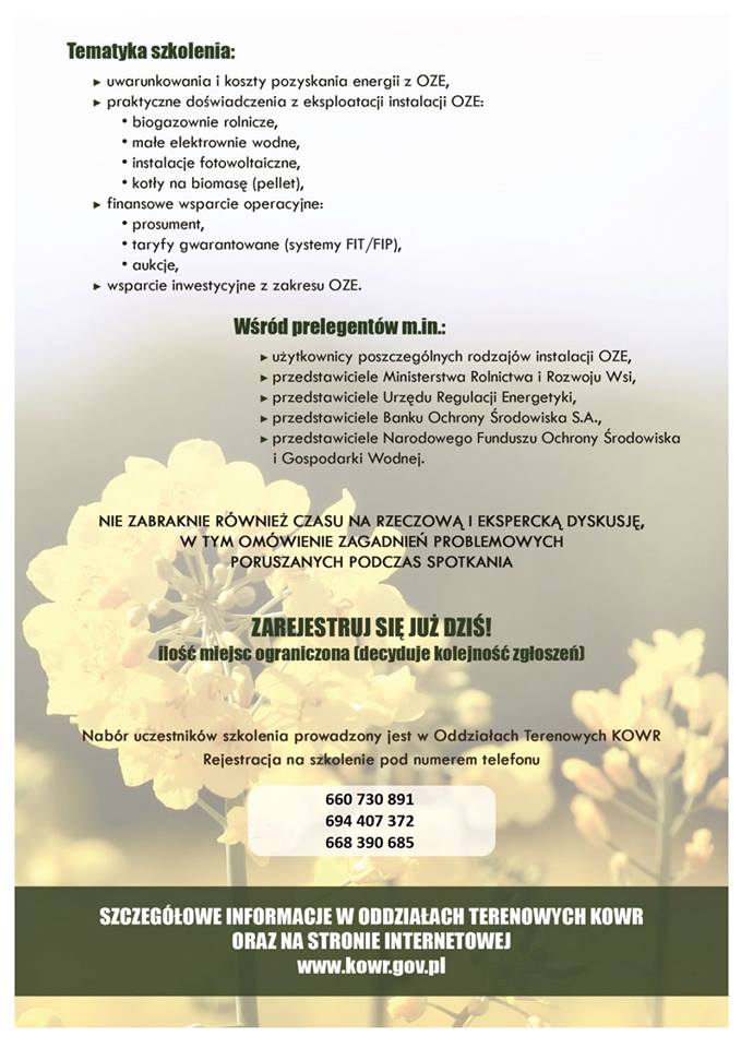Nabór uczestników szkolenia prowadzony jest w Oddziałach Terenowych KOWR. Rejestracja na szkolenie pod nr tel. 660 730 891, 694 407 372, 668 390 685.