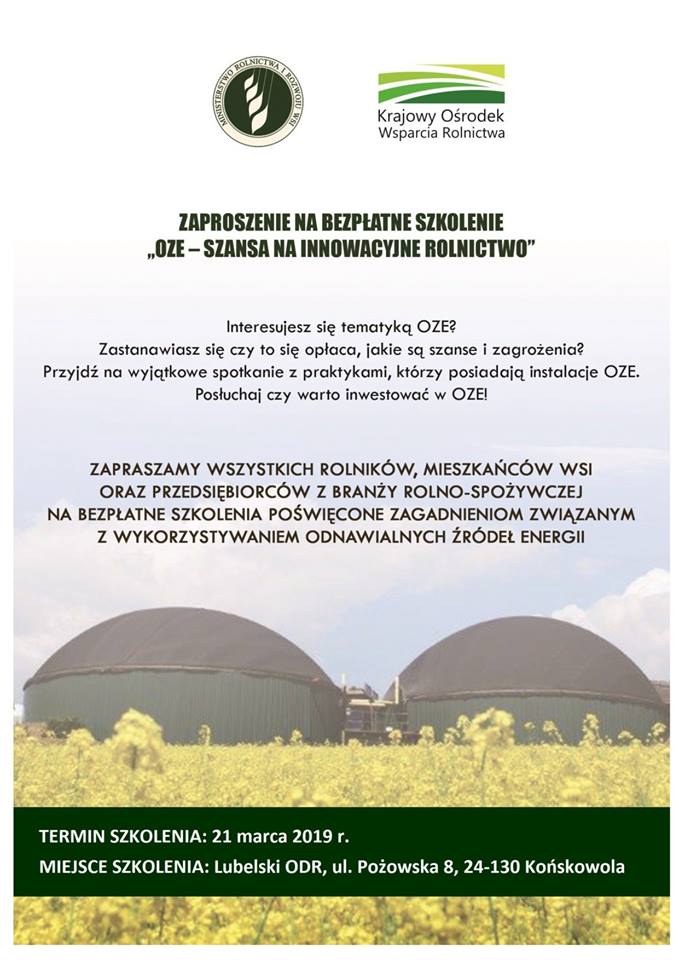 Szkolenie „OZE – szansa na innowacyjne rolnictwo” odbędzie się 21 marca (czwartek) w Lubelskim ODR, ul. Pożowska 8, 24-130 Końskowola.