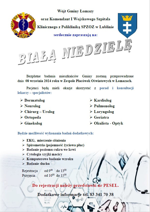 Wójt Gminy Łomazy oraz Komendant I Wojskowego Szpitala Klinicznego z Polikliniką SPZOZ w Lublinie serdecznie zapraszają wszystkich mieszkańców gminy na “Białą Niedzielę”. To wyjątkowa okazja, by skorzystać z bezpłatnych porad i konsultacji lekarskich u specjalistów.