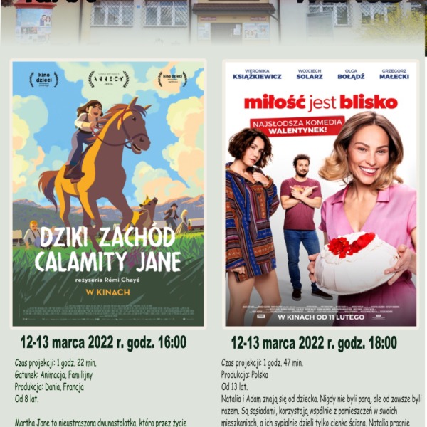 Kino Wenus zaprasza na seanse. W dniach 12-13 marca odbędzie się projekcja dwóch filmów: “Dziki zachód Calamity Jane” oraz “Miłość jest blisko”.