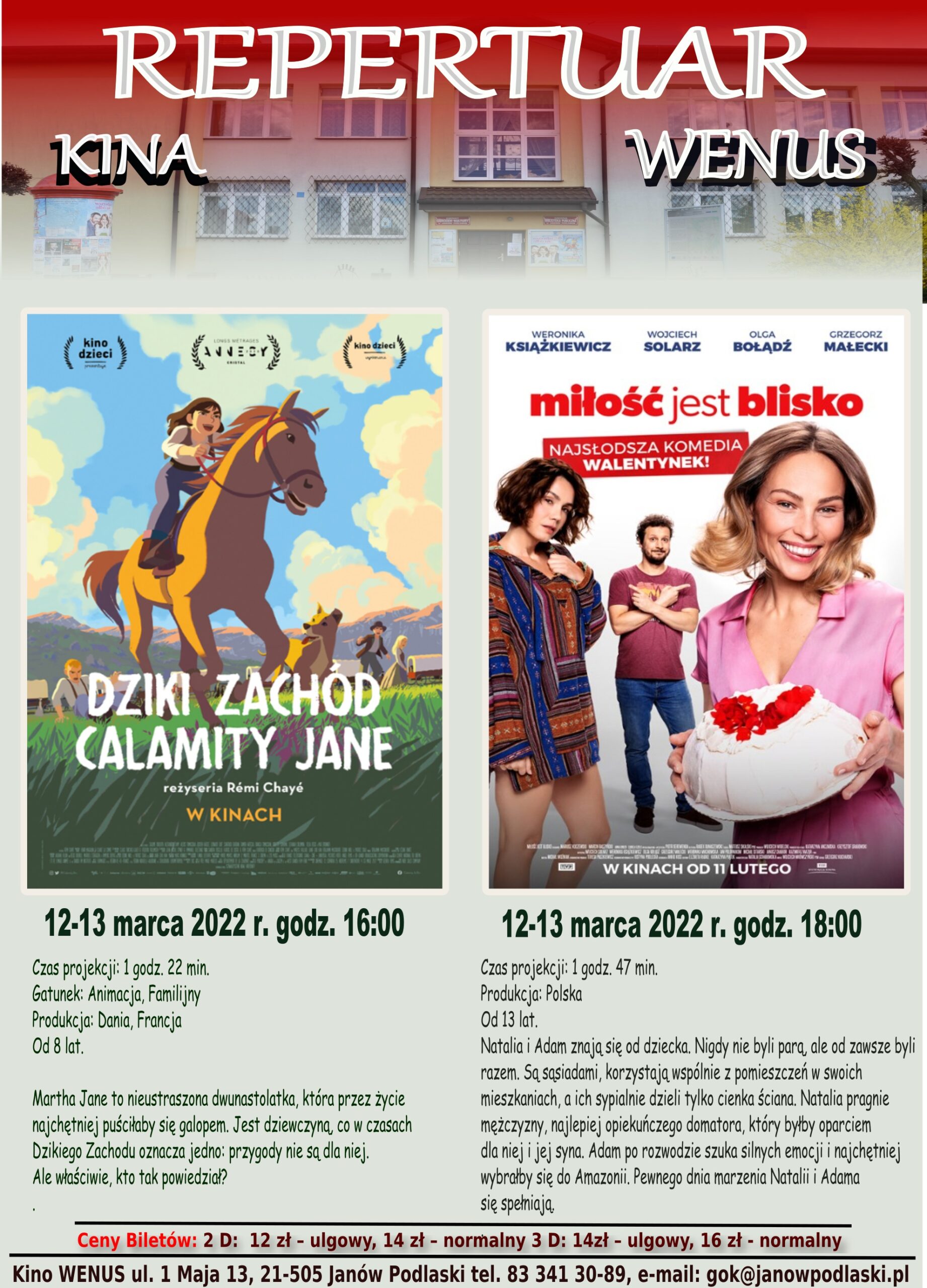 Kino Wenus zaprasza na seanse. W dniach 12-13 marca odbędzie się projekcja dwóch filmów: “Dziki zachód Calamity Jane” oraz “Miłość jest blisko”.