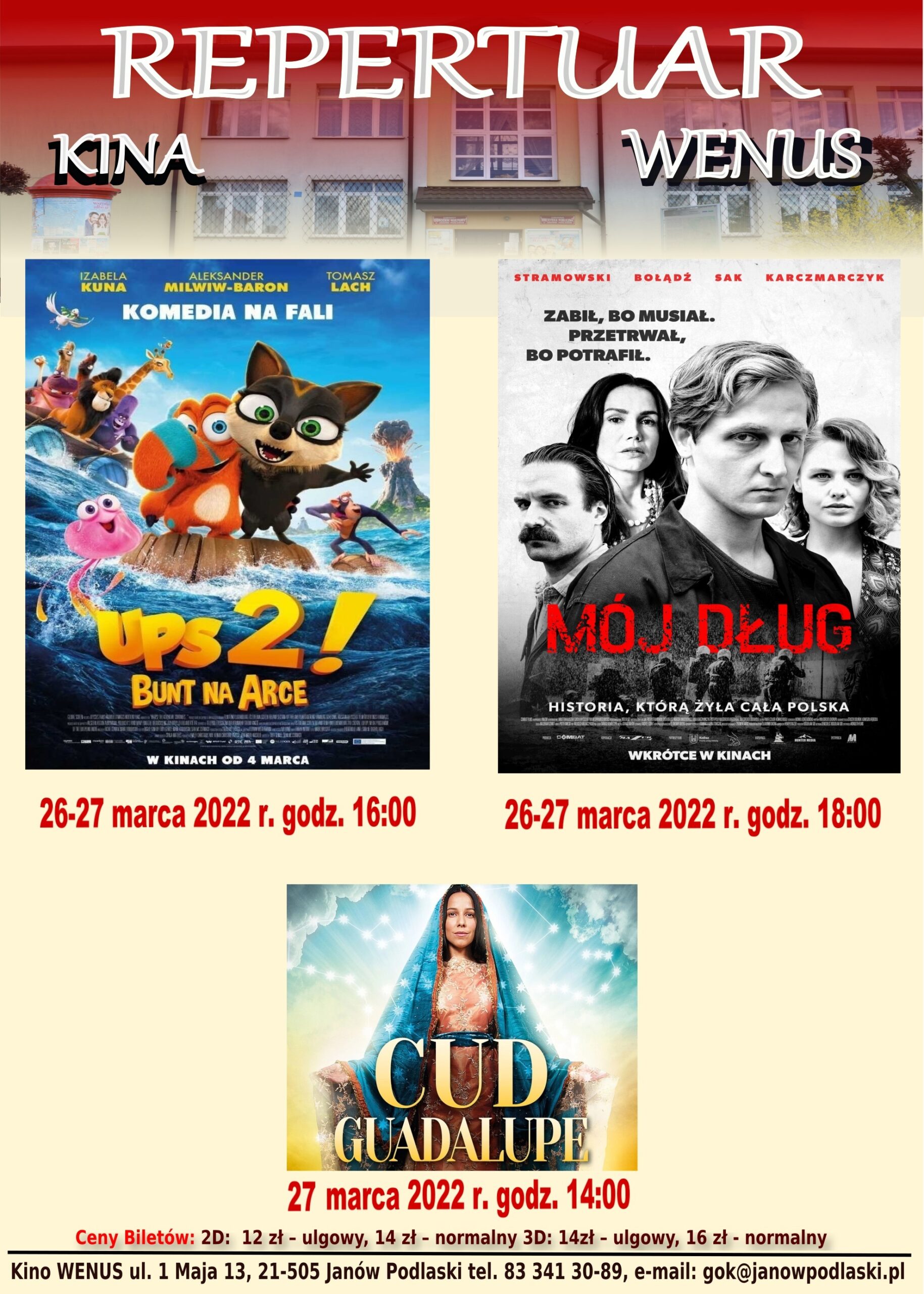 Gminny Ośrodek Kultury w Janowie Podlaskim zaprasza do zapoznania się z repertuarem Kina Wenus na miesiąc marzec. Na ekranie m.in. “Mój Dług” czy “Cud Guadalupe”.