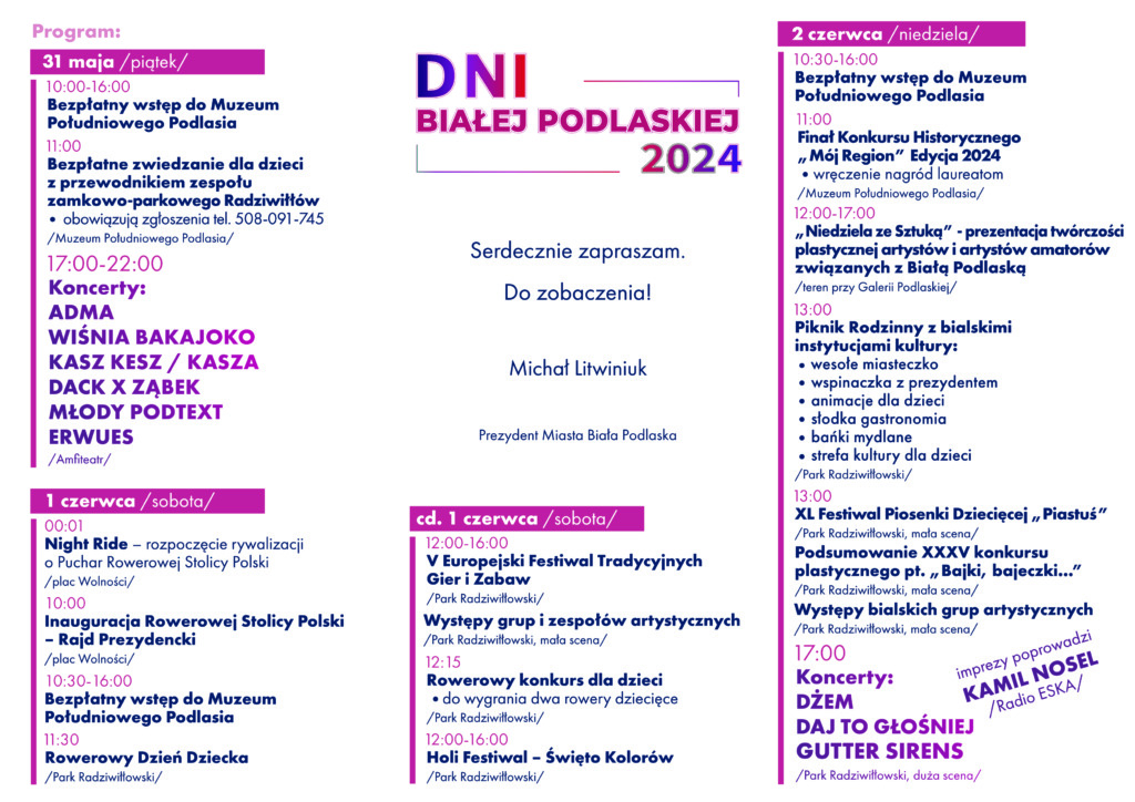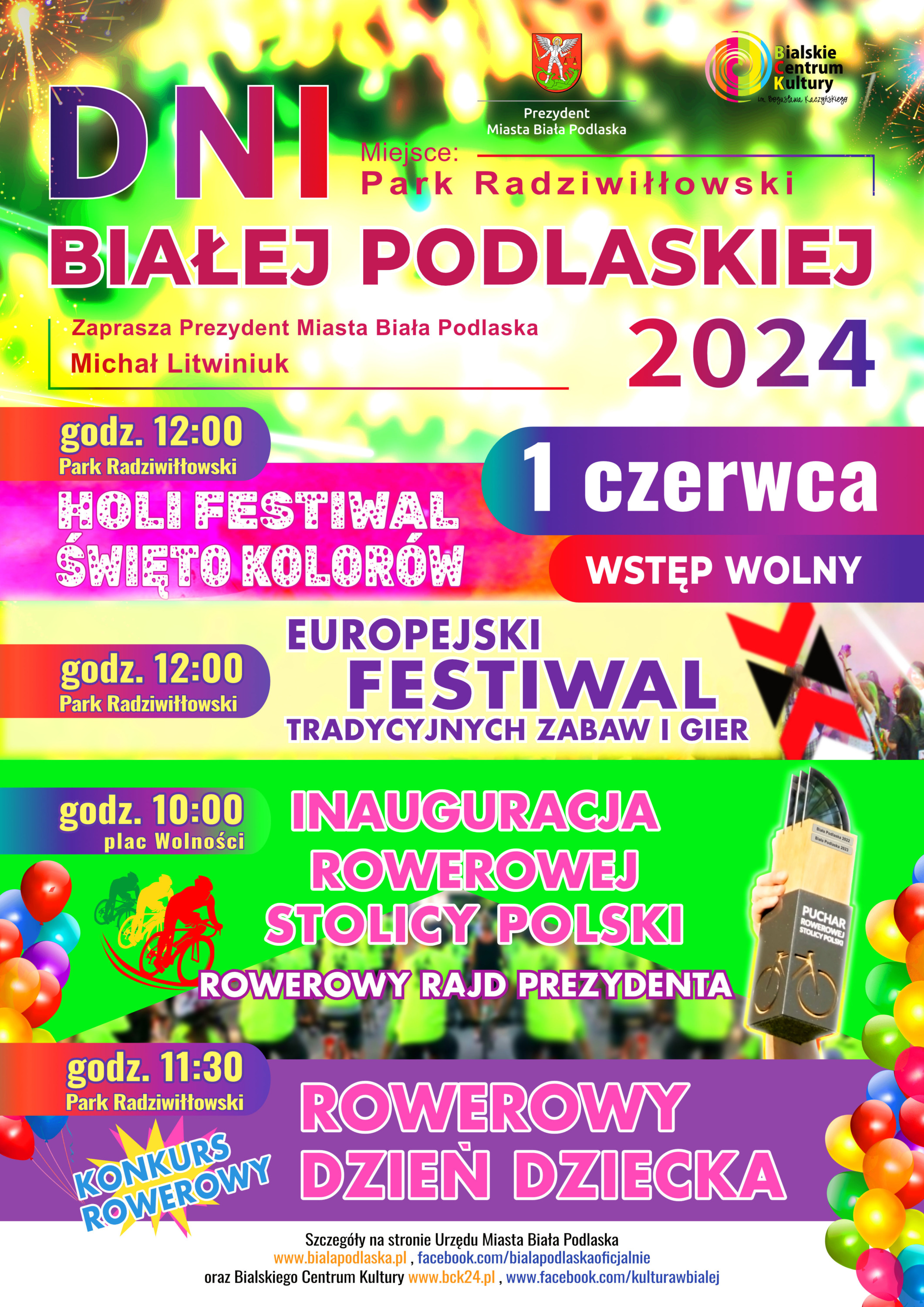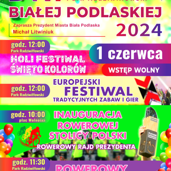 W pierwszy weekend czerwca Biała Podlaska stanie się centrum rozrywki i kultury podczas Dni Białej Podlaskiej 2024. W programie występy takich zespołów jak Daj to głośniej, Gutter Sirens czy Dżem. Dla najmłodszych zaplanowano m.in. Europejski Festiwal Tradycyjnych Gier i Zabaw oraz Holi Święto Kolorów.