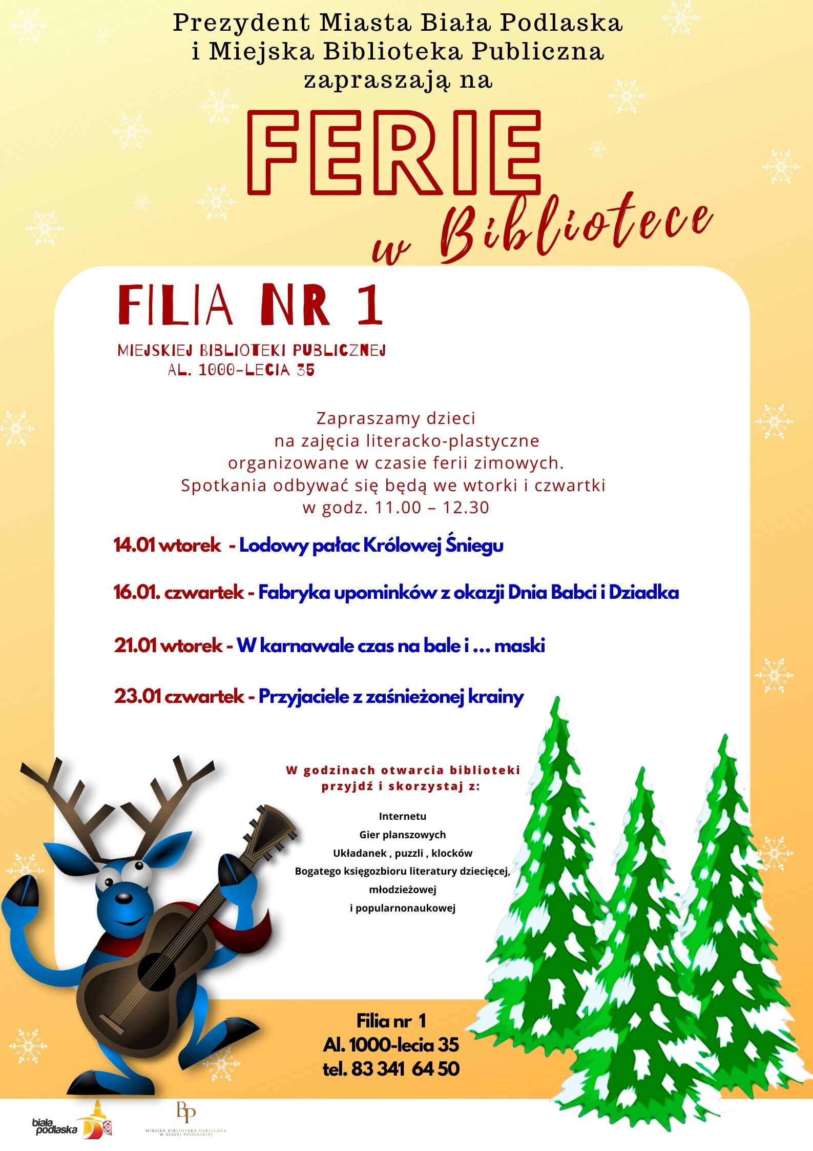 Miejska Biblioteka Publiczna w Białej Podlaskiej zaprasza wszystkie dzieci do spędzenia ferii zimowych w przestrzeni biblioteki. Jak co roku pracownicy biblioteki Barwnej, Filii nr 1,3 i 6 oraz instruktorzy z Multicentrum przygotowali bardzo bogatą ofertę zajęć edukacyjnych i zabaw, które są doskonałym sposobem na wykorzystanie wolnego czasu.