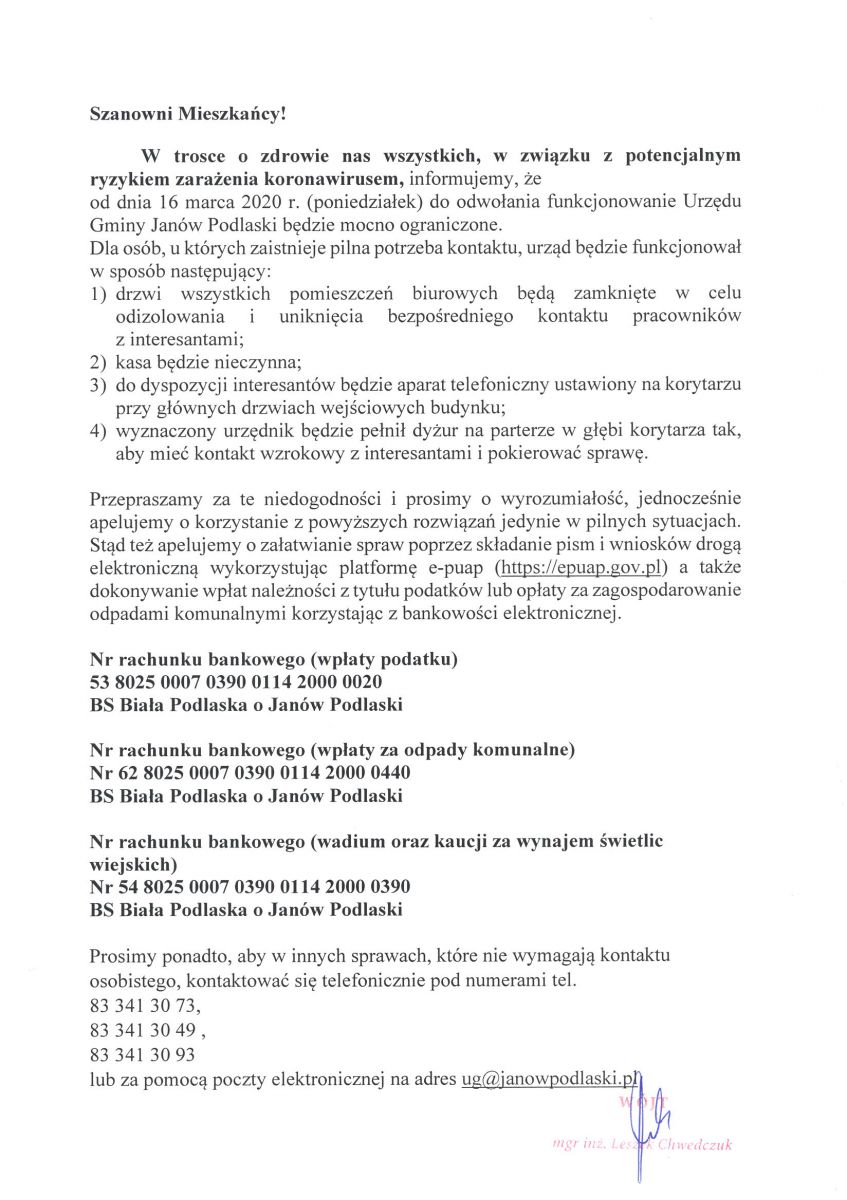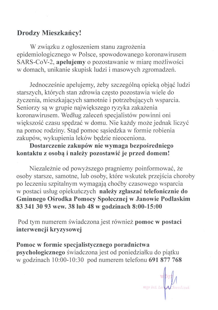 jk / 15 marca 2020 Informacja dla mieszkańców gminy Janów Podlaski Share this...FacebookPinterestTwitterLinkedin kategorie: Janów Podlaski, Powiat Bialski Najpopularniejsze artykuły w tym tygodniuWładze gminy odwiedziły firmę KONTUR w Woskrzenicach DużychKradzież paliwa, pościg i czołowe zderzenie. 36-latek zatrzymany przez bialską prewencjęPo policyjnym pościgu i kontroli SG obywatel Ukrainy wydalony z PolskiWisznice uczczą 235. rocznicę uchwalenia Konstytucji 3 Maja Bądź pierwszym który zostawi komentarz. Dodaj komentarzTwój adres e-mail nie zostanie opublikowany. Wymagane pola są oznaczone * Użytkowniku, pamiętaj, że w Internecie nie jesteś anonimowy. Ponosisz odpowiedzialność za treści zamieszczane na portalu bialanews.pl. Dodanie opinii jest równoznaczne z akceptacją Regulaminu portalu. Najnowsze galerie „Igłą malowane” po raz osiemnasty. Ogólnopolski Konkurs Koronkarski rozstrzygnięty Dance Academy Studio z 14 medalami na Pucharze Polski w Tańcu Nowoczesnym w Markach Szef kuchni Karol Okrasa z wizytą w ZSCKR w Leśnej Podlaskiej Po pierwsze Kobieta – relacja ze spotkania profilaktycznego w bialskim szpitalu Koncerty, spektakl i gwiazda wieczoru. Dzień Kobiet w Terespolu Najnowsze artykuły Podpisano umowę na rewitalizację zespołu dworsko-pałacowego w Wilczynie Kierowca przewożący mrożoną brukselkę posłużył się podrobionym dokumentem Zapraszają na 7. Festiwal Muzyki Organowej i Kameralnej Terespol zaprasza na XIX Otwarty Przegląd Zespołów Tanecznych „LOVE TO DANCE” 2026 XXVII Pielgrzymka Strażaków Powiatu Bialskiego Wścieklizna wykryta w powiecie bialskim. Zakażony kot ugryzł właściciela
