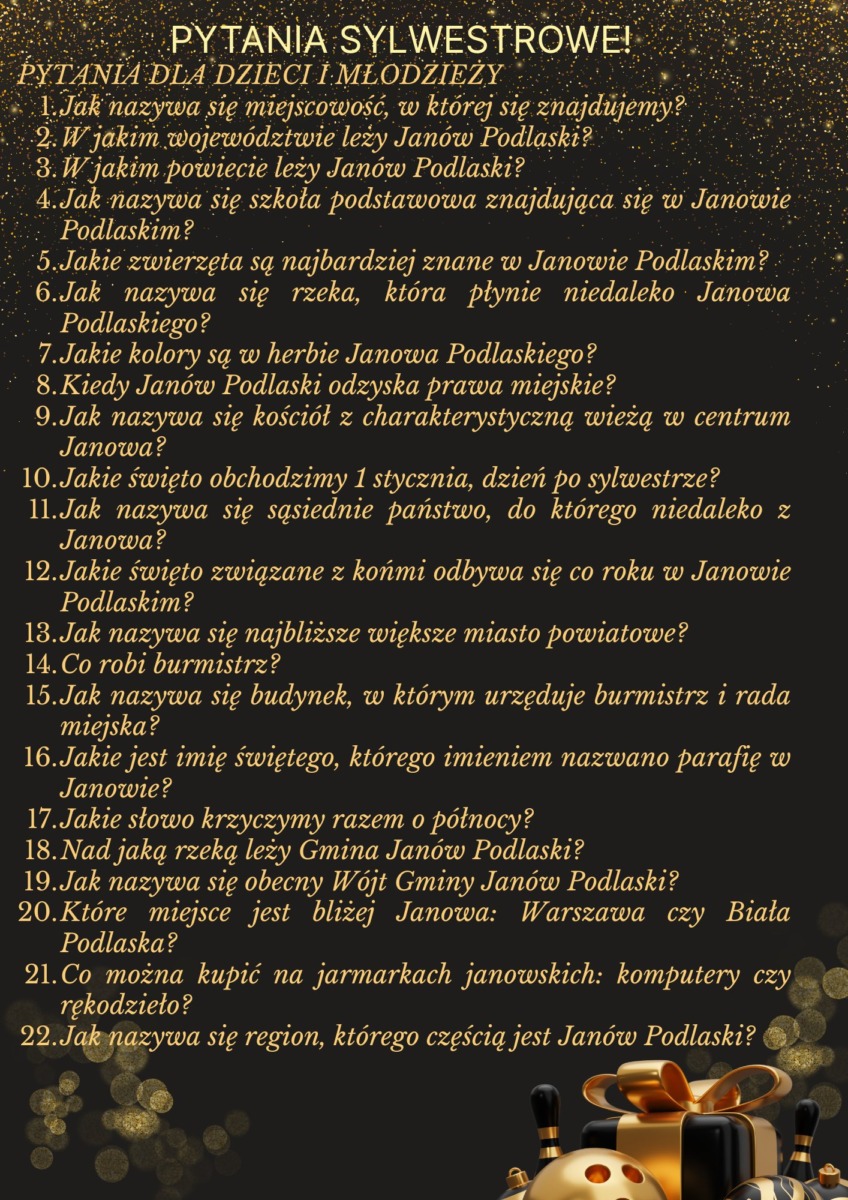 Sylwestrowa noc 2025 roku będzie dla mieszkańców Janowa Podlaskiego wyjątkowa. 31 grudnia odbędzie się uroczyste świętowanie z okazji nadania miejscowości praw miejskich. Wydarzenie zaplanowano w centrum Janowa Podlaskiego, na parkingu, gdzie od godziny 21:00 do 1:00 potrwa wspólna zabawa.