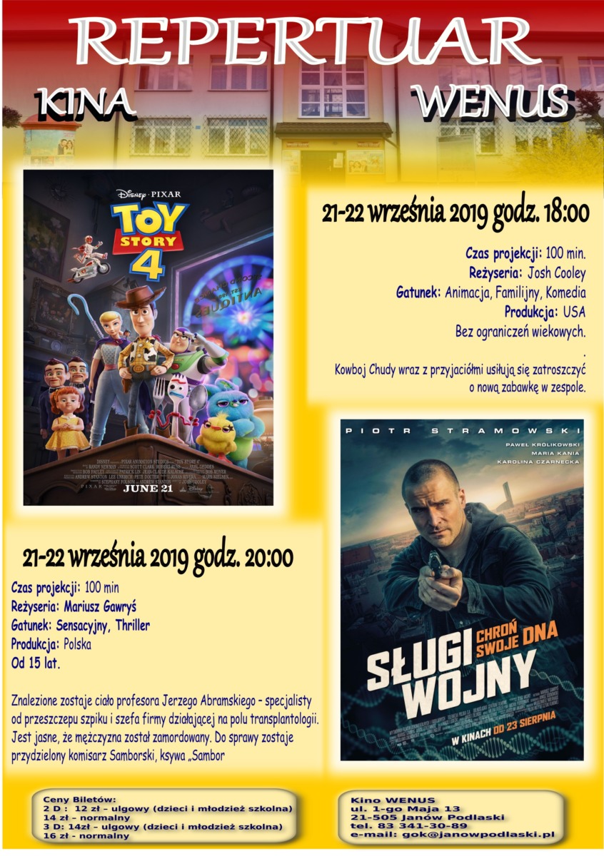 21 i 22 września w kinie Wenus będzie można zobaczyć filmy takie jak “Toy Story 4″( godz. 18.00) oraz “Sługi wojny”( godz. 20.00).