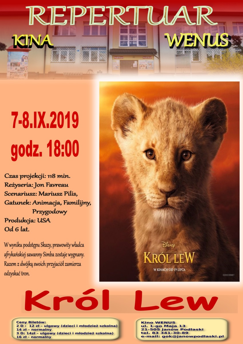 Kolejne seanse od 7 do 8 września o godz. 18.00. W tych dniach odbędzie się projekcja filmu “Król lew”.