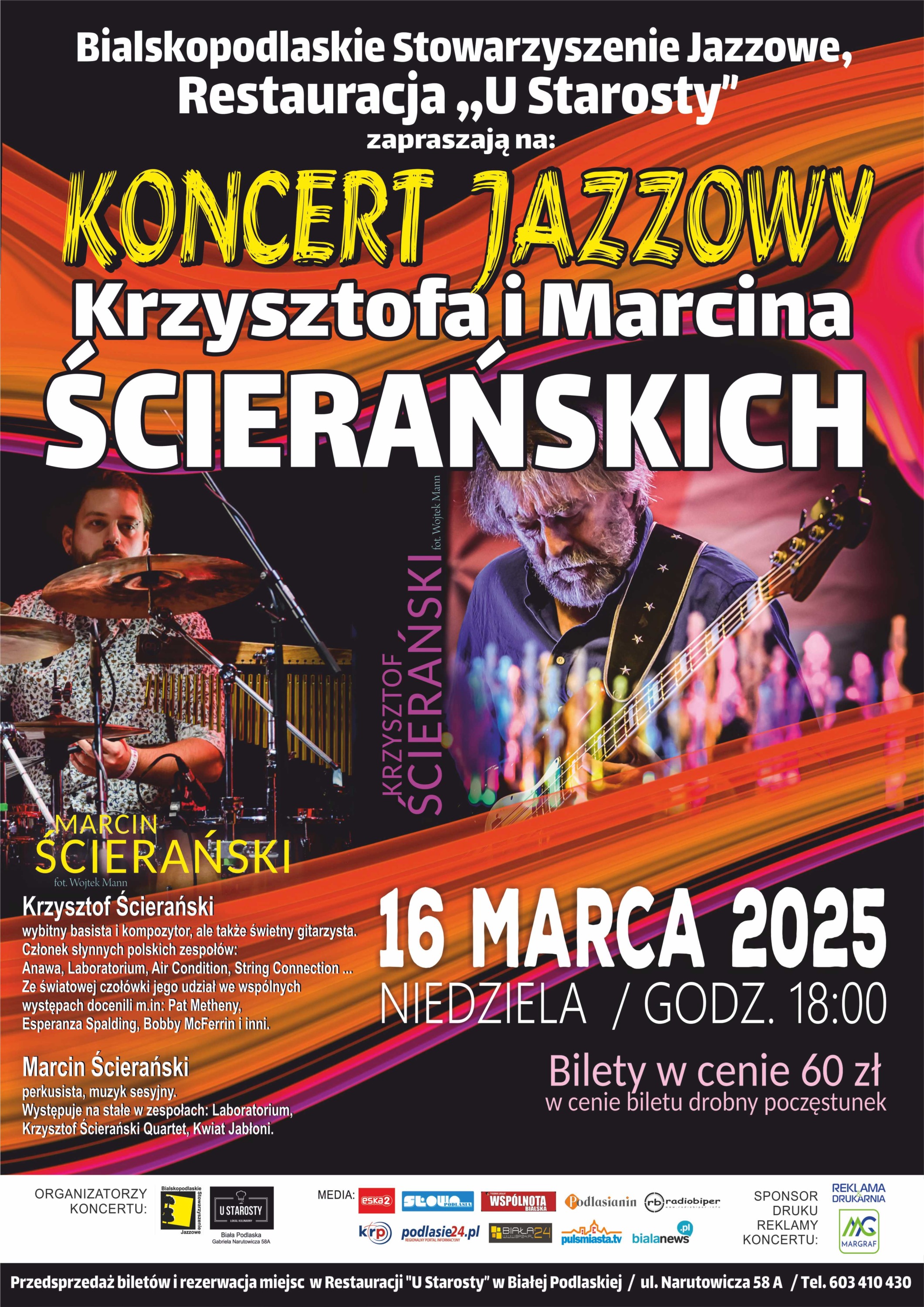 Bialskopodlaskie Stowarzyszenie Jazzowe oraz Restauracja „U Starosty” zapraszają na wyjątkowy koncert jazzowy w wykonaniu Krzysztofa i Marcina Ścierańskich. Wydarzenie odbędzie się 16 marca 2025 roku (niedziela) o godzinie 18:00 w Restauracji „U Starosty” w Białej Podlaskiej.
