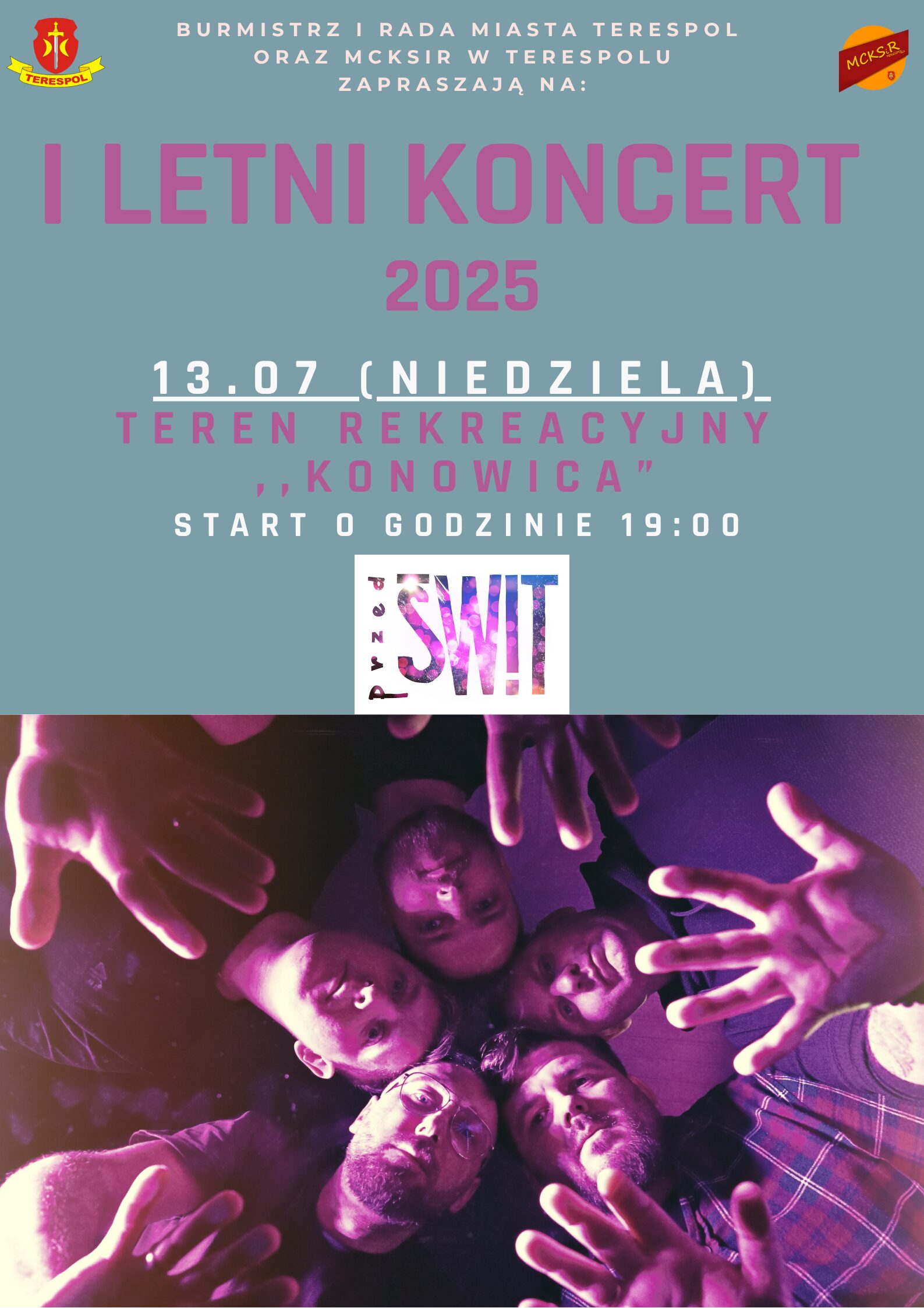 Miejskie Centrum Kultury, Sportu i Rekreacji zaprasza na I Letni Koncert w ramach Letnich Koncertów w Terespolu. Na scenie pojawi się zespół PRZEDŚWIT.