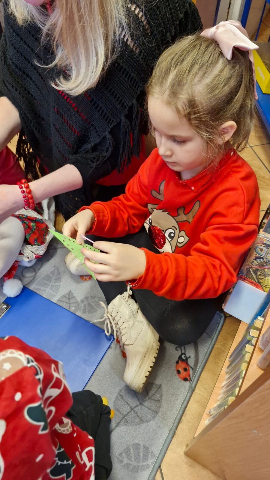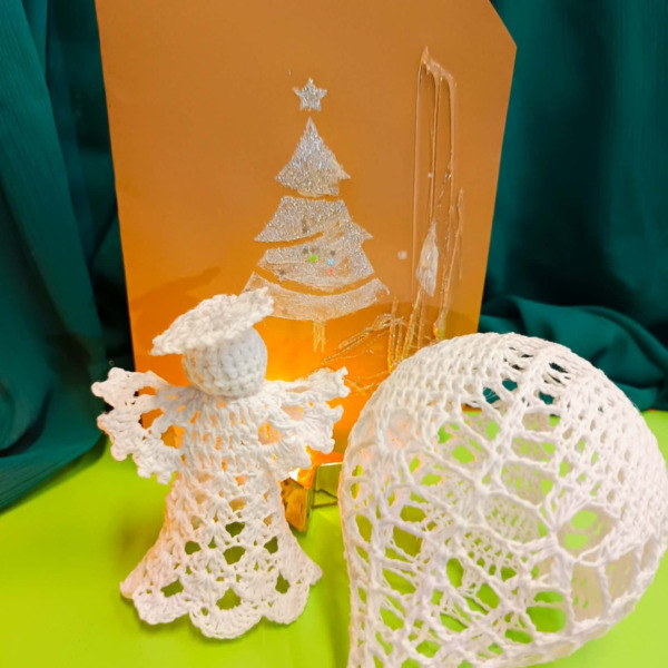 Dzieci wspólnie wysłuchały książki „Opowiem Ci, mamo, o świętym Mikołaju”, która stała się inspiracją do rozmów o mikołajkowych tradycjach oraz zimowych zwyczajach. Następnie mali goście z dużym zaangażowaniem przystąpili do zajęć plastycznych, podczas których tworzyli własnoręczne kartki bożonarodzeniowe. Praca wymagała skupienia i precyzji, zwłaszcza przy dekorowaniu choinek włóczką.
