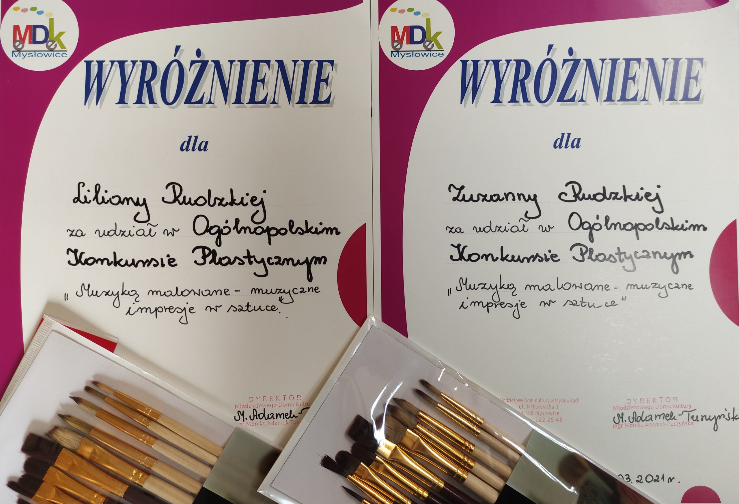 Kolejne wspaniałe wieści o sukcesach podopiecznych Bialskiego Centrum Kultury. Czwartoklasistki Lilianna i Zuzanna Rudzkie wyróżnione w Ogólnopolskim Konkursie Plastycznym w kategorii klas IV- VIII „Muzyką malowane – muzyczne impresje w sztuce”, zorganizowanego przez Młodzieżowy Dom Kultury w Mysłowicach. W konkursie brały udział szkoły podstawowe, szkoły ponadpodstawowe i placówki oświatowe z całej Polski.