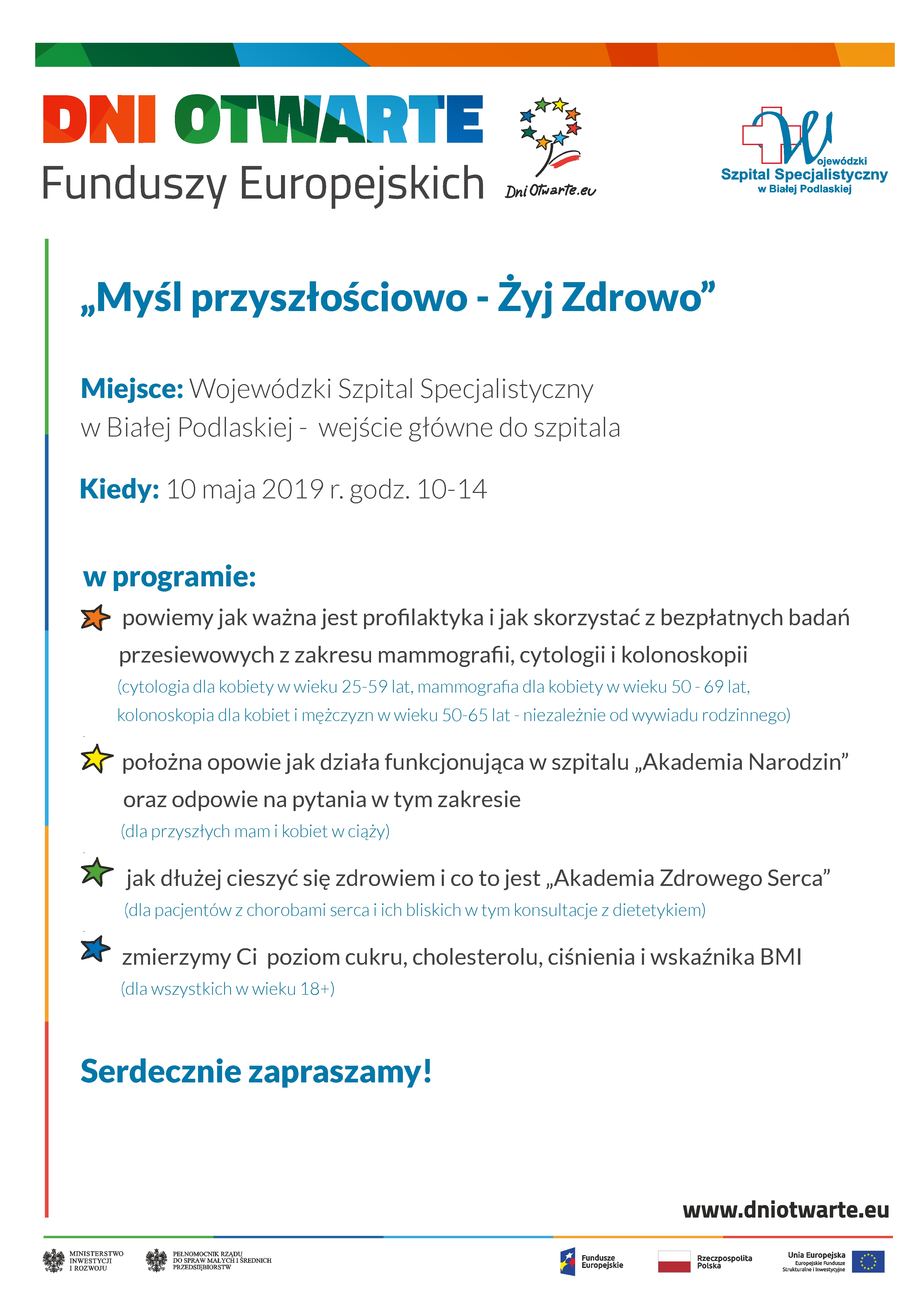 Wojewódzki Szpital Specjalistyczny w Białej Podlaskiej zaprasza na Dni Otwarte Funduszy Europejskich pt. „Myśl Przyszłościowo – Żyj Zdrowo!”. W tym dniu będzie można skorzystać z darmowych konsultacji i porad.