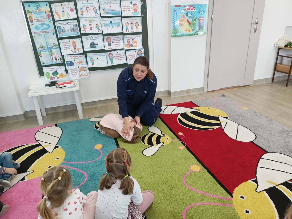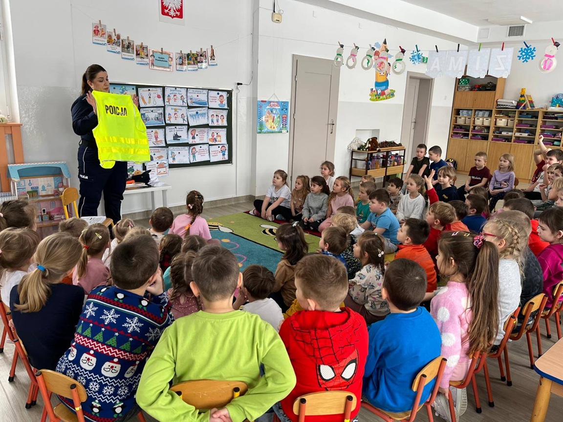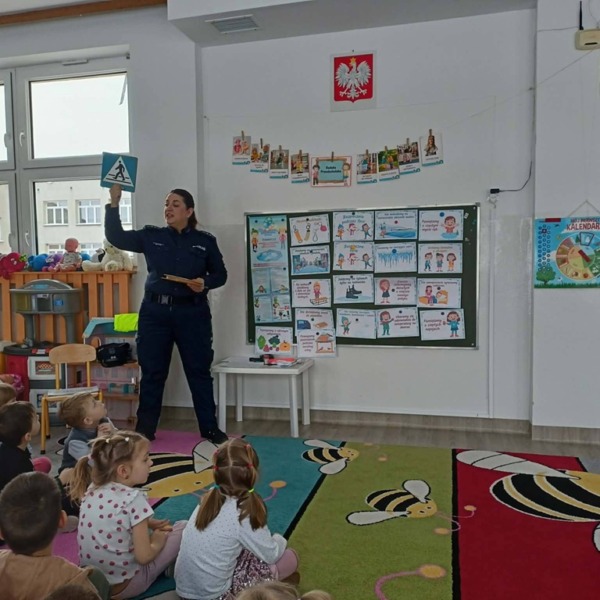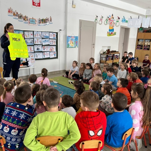 Policjantka przedstawiła dzieciom najważniejsze informacje związane z prawidłowym zachowaniem na drogach. W przystępny dla nich sposób przedstawiła obowiązujące przepisy. Uczulała, aby zawsze korzystać z przejść dla pieszych omawiając dokładnie zasady bezpiecznego przejścia przez jezdnię. Apelowała by nigdy nie wbiegać na jezdnię ani nie wchodzić na nią zza pojazdu lub innej przeszkody. Podczas wizyty zachęcała też do korzystania z elementów odblaskowych tłumacząc jak ważne jest “bycie widocznym na drodze”.
