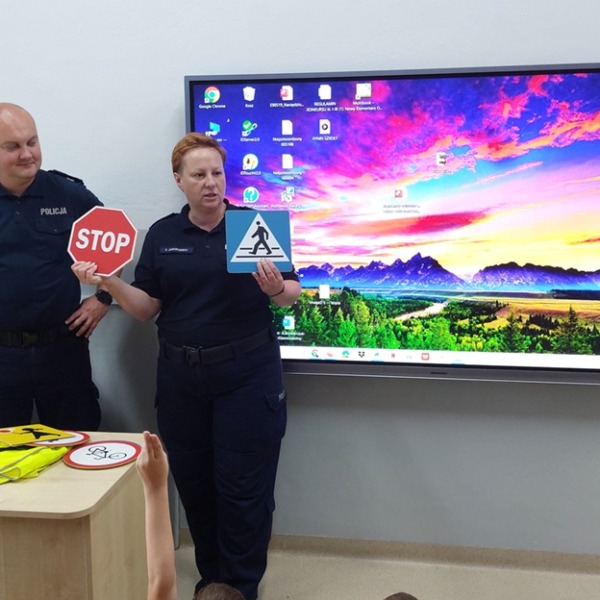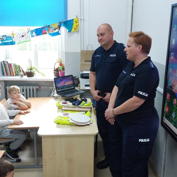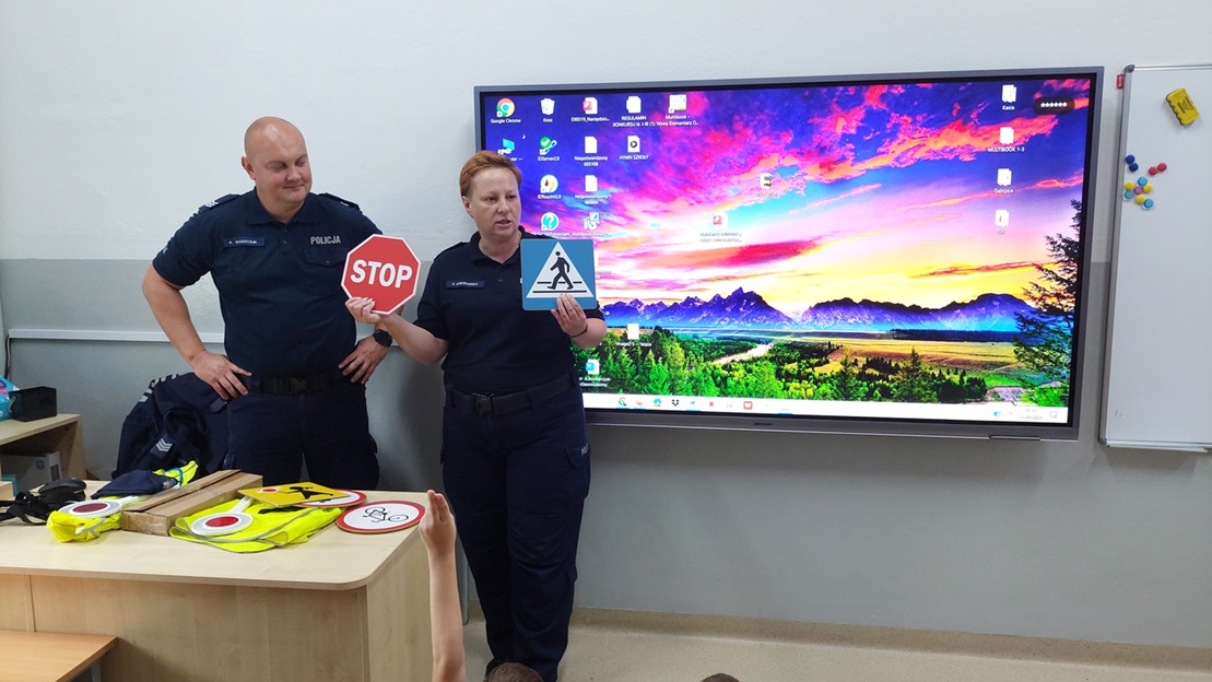 Na początku spotkania funkcjonariusze przypomnieli uczniom zasady poruszania się po drogach, a także bezpiecznego przechodzenia przez jezdnię. Nie zabrakło też informacji na temat znaków drogowych dotyczących pieszych jak też elementów odblaskowych i ich wpływu na bezpieczeństwo. Policjantka instruowała też w jaki sposób prawidłowo korzystać z chodnika i jak zachować się gdy go nie ma. Przedstawiała obowiązujące przepisy w przystępny dla najmłodszych sposób. W trakcie pogadanki pierwszaki przygotowały dla wszystkich niespodziankę. Zaprezentowały wierszyk dotyczący bezpieczeństwa w ruchu drogowym.