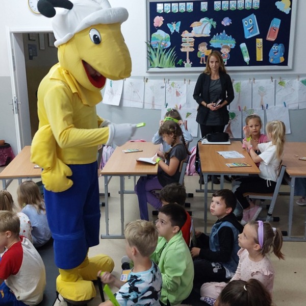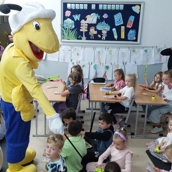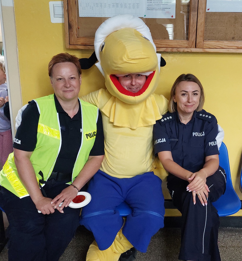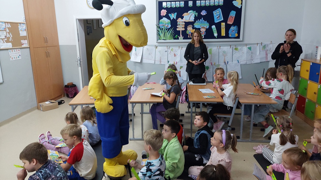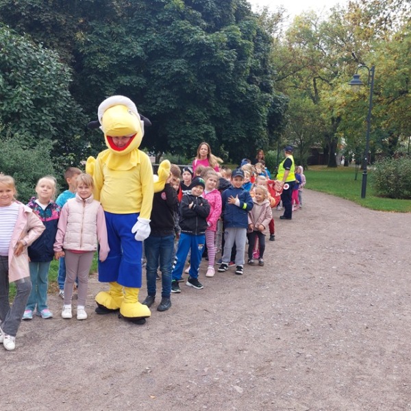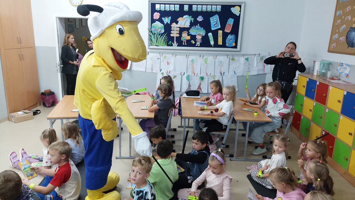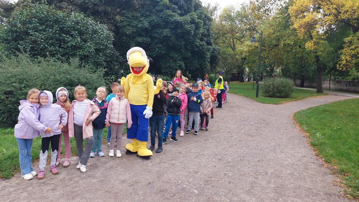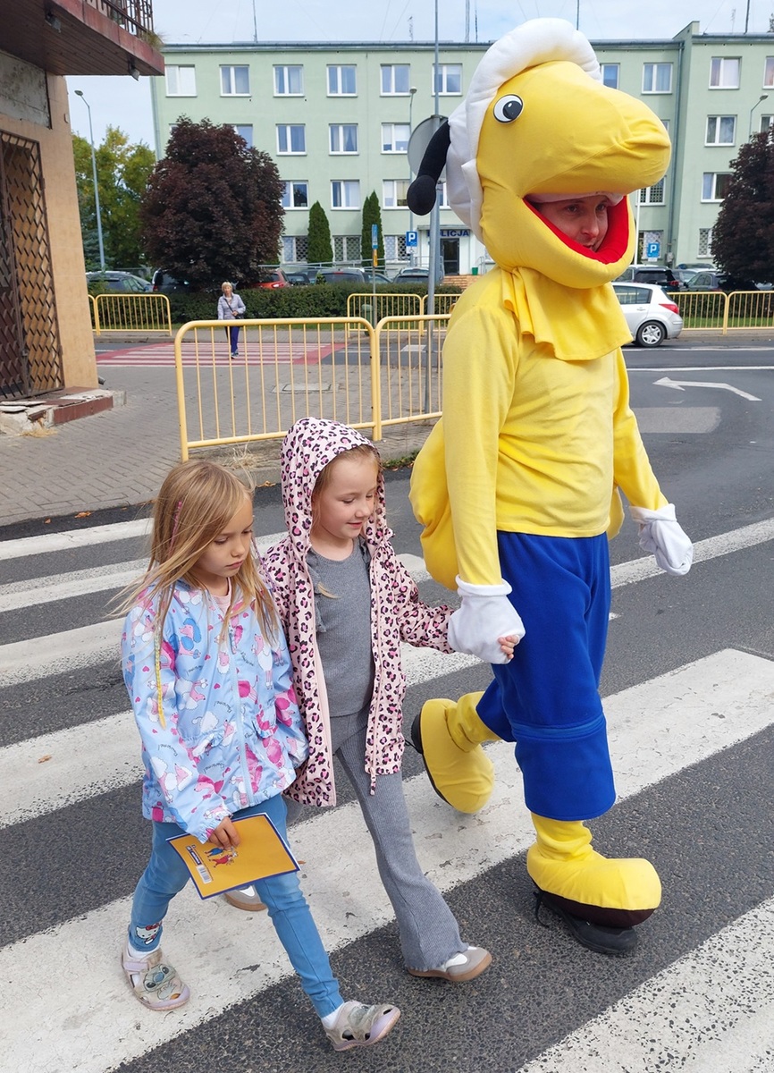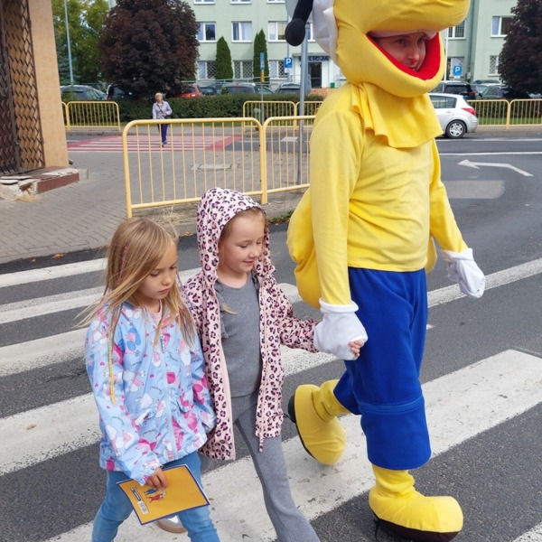 Nie była to jedyna atrakcja przygotowana tego dnia dla najmłodszych. Dodatkowo czekała na nich maskotka z PSB Mrówka z Białej Podlaskiej, a także elementy odblaskowe dla każdego z uczniów. Pierwszaki z radością przechodziły przez przejście dla pieszych trzymając za ręką przesympatyczną żółtą maskotkę. Uśmiech przez cały czas gościł na twarzach uczniów, którzy zobowiązali się wszystkie uzyskane informacje wykorzystywać każdego dnia.