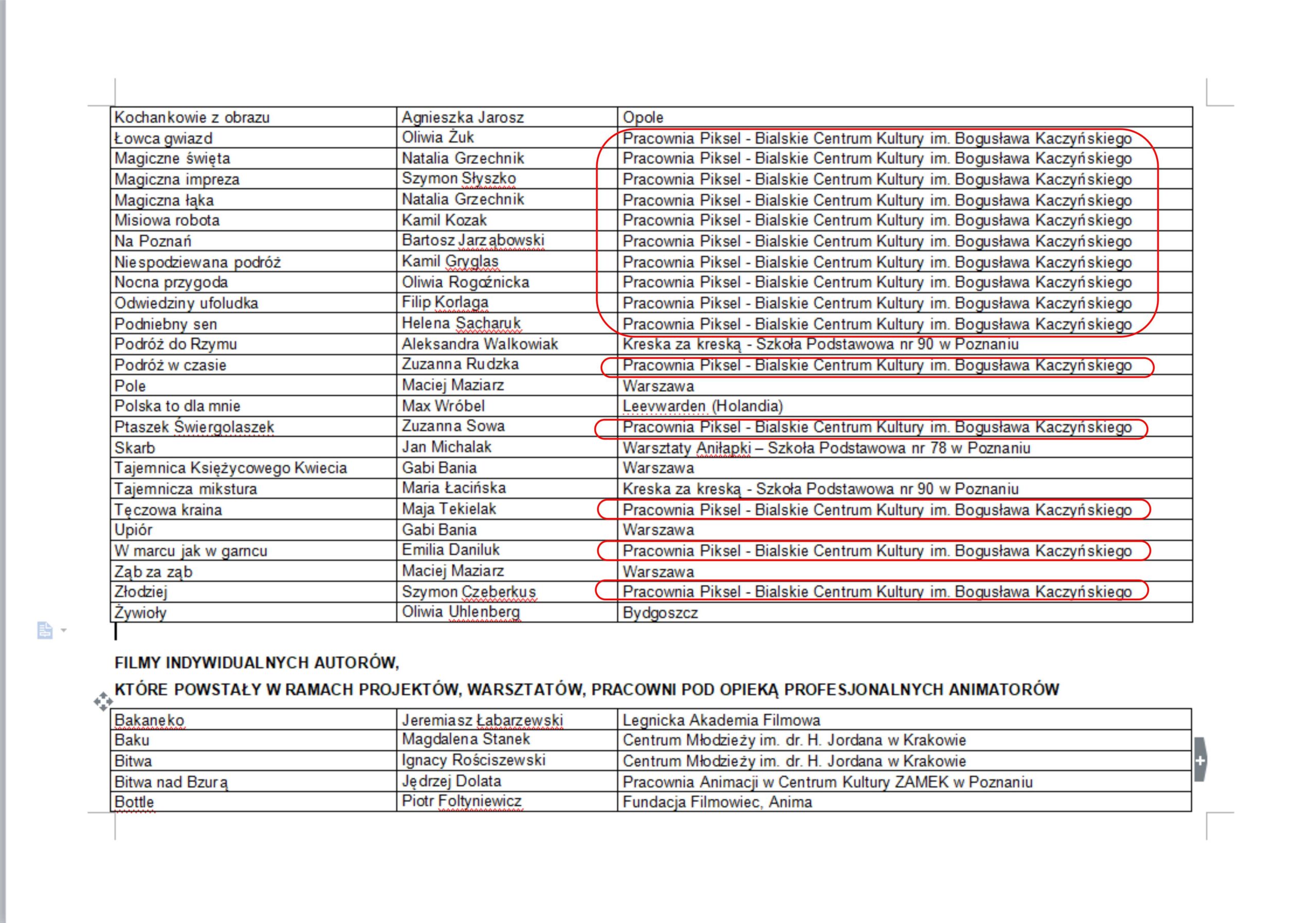Dzieci w bialskiej pracowni Piksel rozwijają swoje umiejętności pod okiem artystki Lilli Wielgan-Michaluk. Filmy ich autorstwa już wkrótce będzie można obejrzeć na dużym ekranie podczas projekcji Letniego Kina w Parku Radziwiłłowskim w Białej Podlaskiej. Tak prezentuje się lista 23 prac zakwalifikowanych do przeglądu: