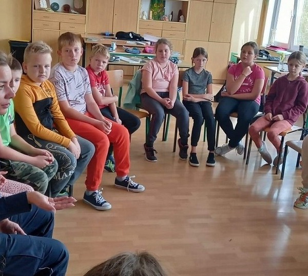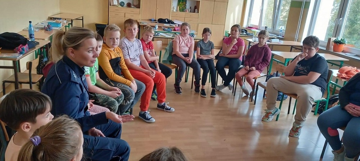 W trakcie spotkania z uczniami opowiedziała zarówno o służbie funkcjonariuszy jak też wyposażeniu wykorzystywanym na co dzień przez mundurowych. Spotkanie było też doskonałą okazją do przeprowadzenia pogadanki w ramach akcji „Bezpieczna droga do szkoły”. Policjantka przedstawiła dzieciom najważniejsze informacje związane z prawidłowym zachowaniem na drogach. W przystępny dla uczniów sposób przedstawiła obowiązujące przepisy. Uczulała, aby zawsze korzystać z przejść dla pieszych omawiając dokładnie zasady bezpiecznego przejścia przez jezdnię. Apelowała by nigdy nie wbiegać na jezdnię ani nie wchodzić na nią zza pojazdu lub innej przeszkody. Podczas wizyty zachęcała też do korzystania z elementów odblaskowych, na zakończenie wręczając każdemu dziecku opaskę odblaskową.