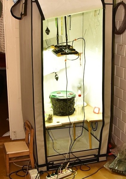 Na miejscu funkcjonariusze potwierdzili posiadane informacje. Ujawnili ponad 50 roślin, w różnej fazie wzrostu. Wysokość niektórych sięgała nawet do 2,5 m. Część roślin znajdowała się w budynku gospodarczym. Inne wysadzone były w różnych miejscach na terenie posesji. W mieszkaniu znajdował się namiot uprawowy wyposażony w specjalistyczny sprzęt służący do hodowli, m.in.: lampy zapewniające odpowiednie oświetlanie uprawy, wentylator oraz wiatrak.