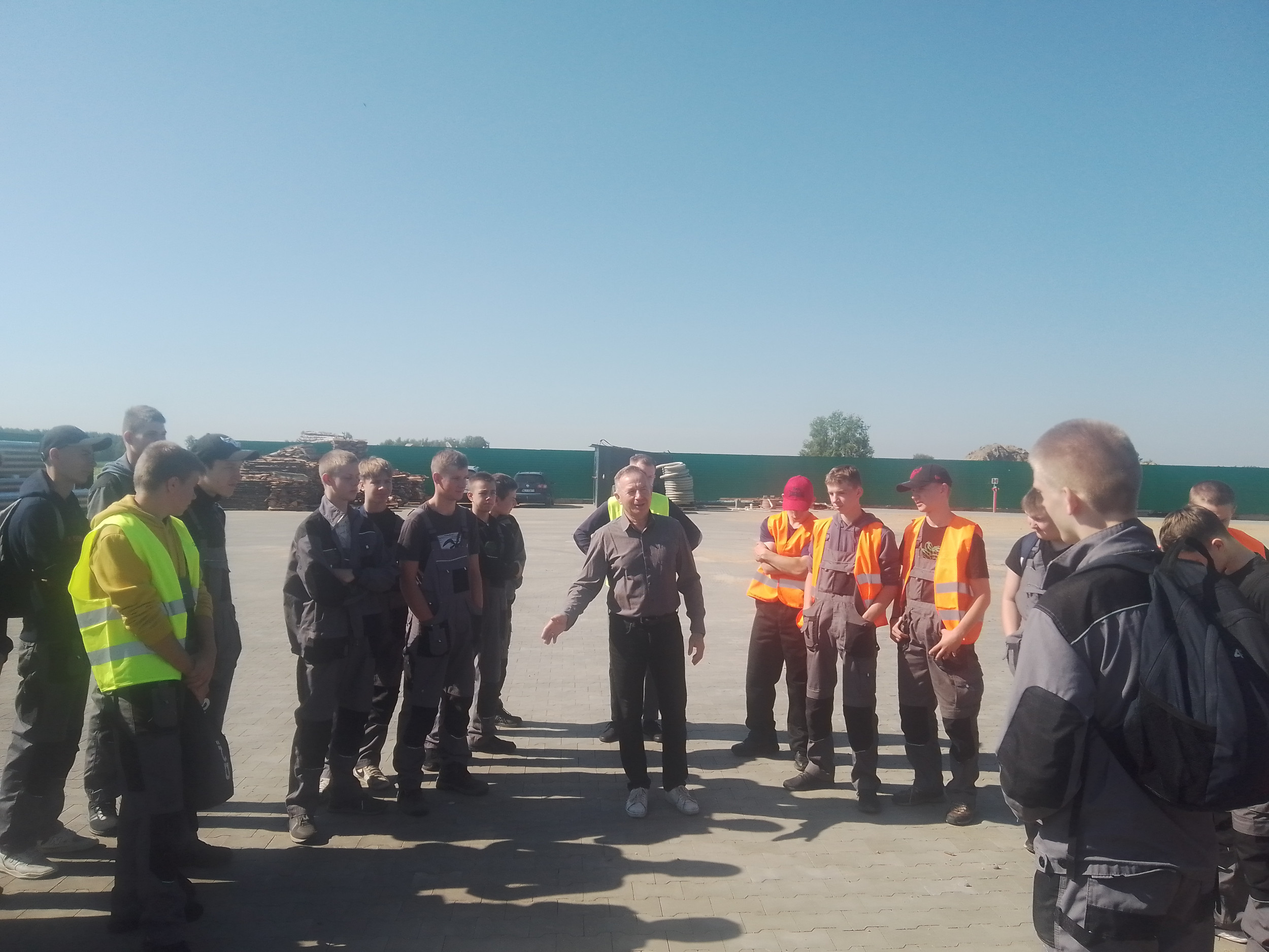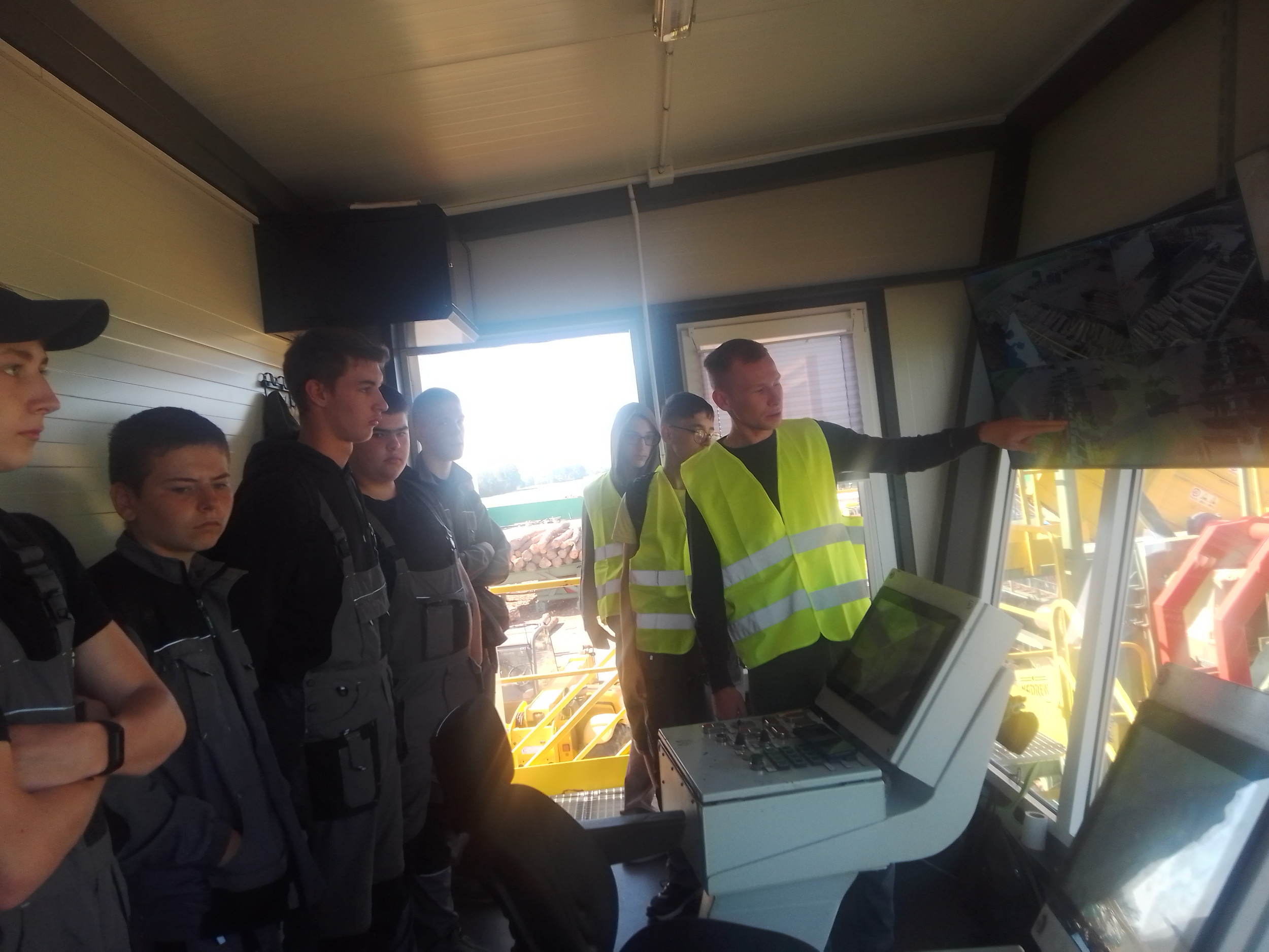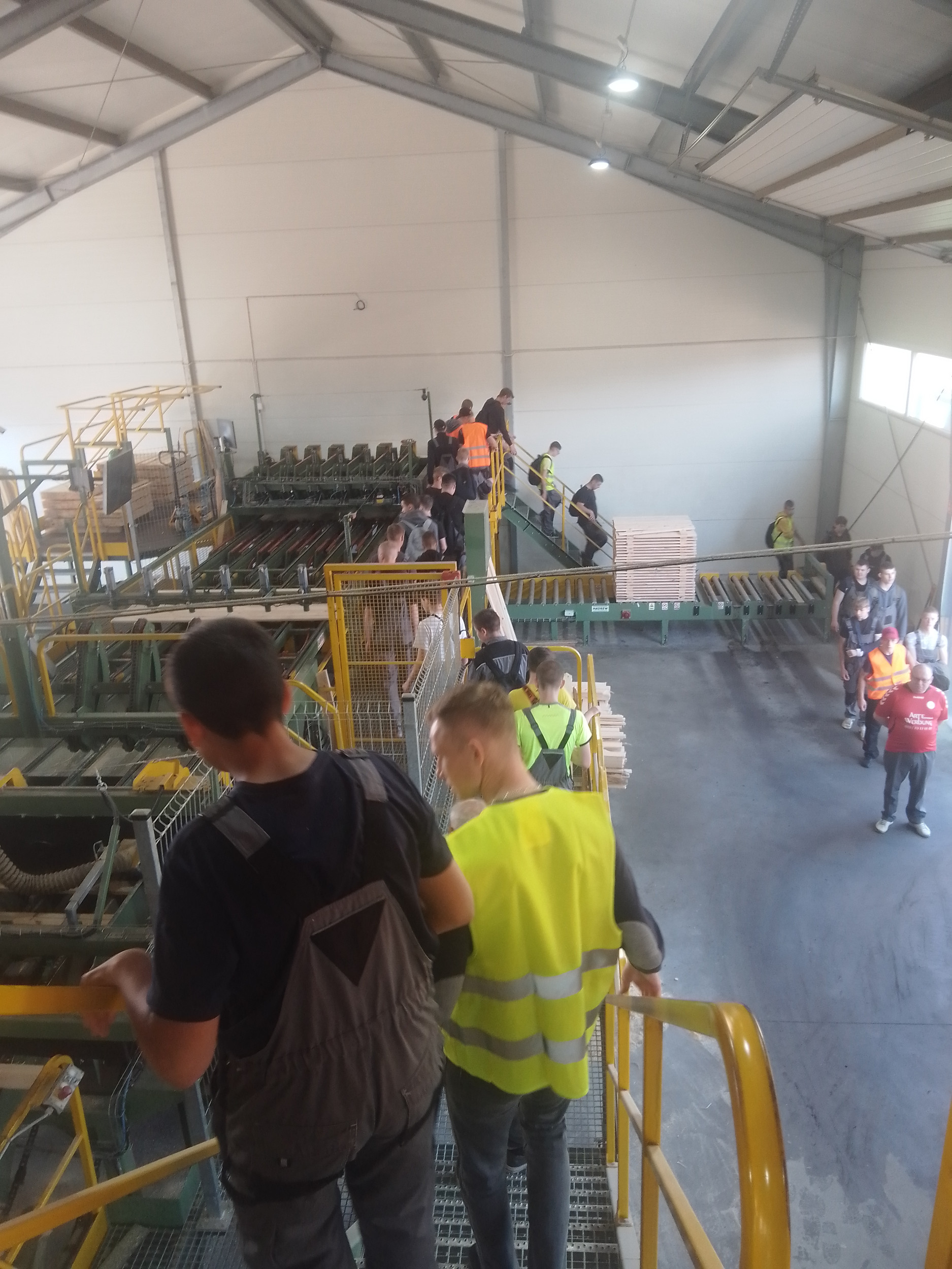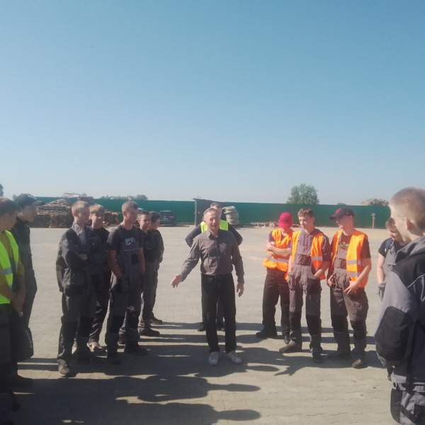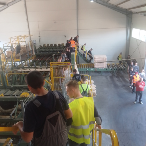Pierwszym punktem programu była wizyta w zakładzie obróbki drewna w Szpakach Nowych, gdzie młodzież mogła zapoznać się z poszczególnymi etapami obróbki drewna. Właściciel zakładu oraz jego syn oprowadzili grupę po terenie, gdzie drewno jest składowane, segregowane i przetwarzane.