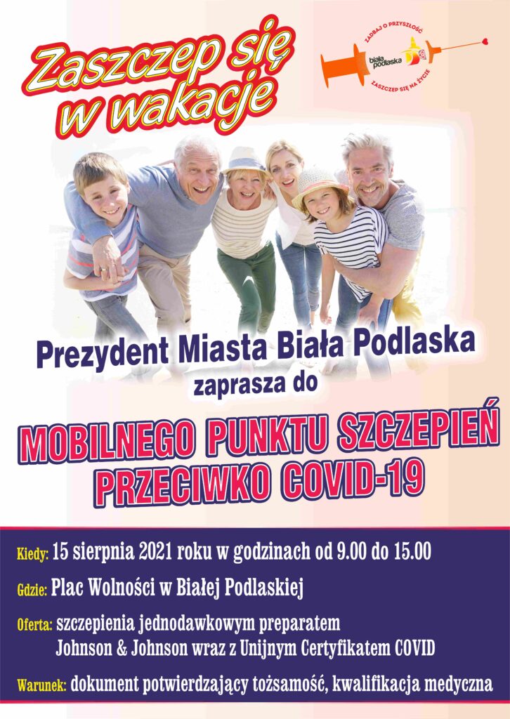 Na dzień dzisiejszy w Białej Podlaskiej w pełni zaszczepionych jest 42,3% mieszkańców. W kategorii gmin średnich 30-100tys mieszkańców Biała Podlaska zajmuje 135 miejsce na 150 gmin. Mobilny punkt szczepień postawiony będzie na placu Wolności, dnia 15 sierpnia.