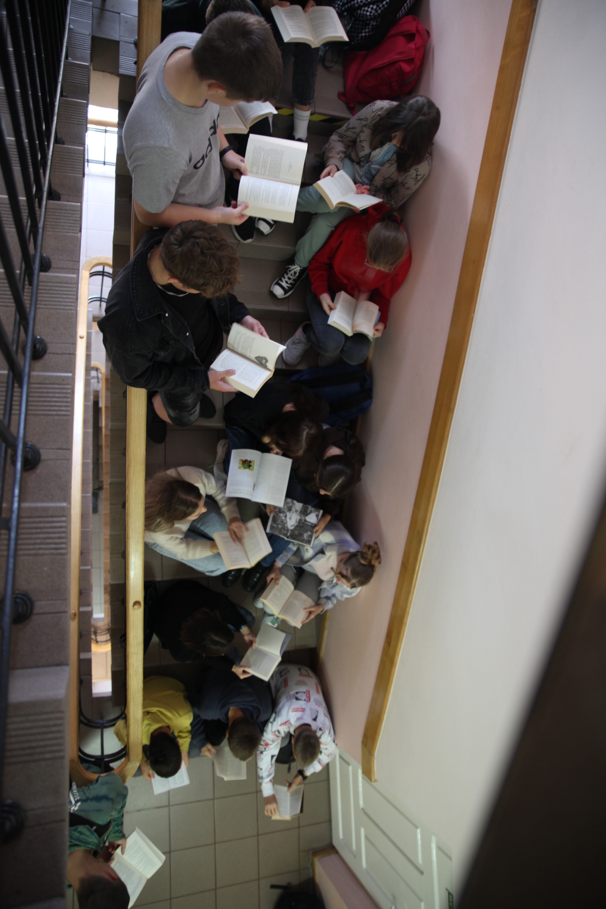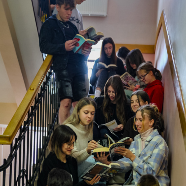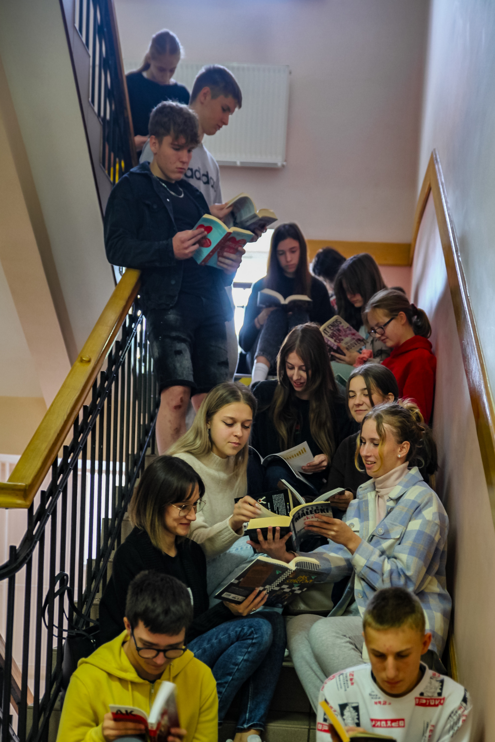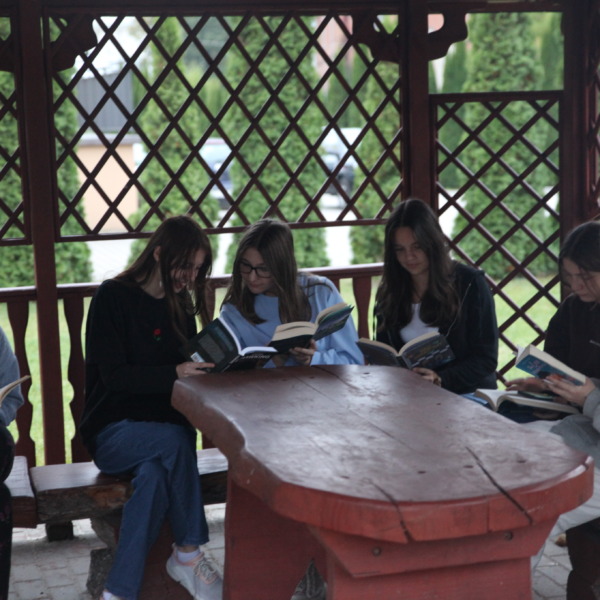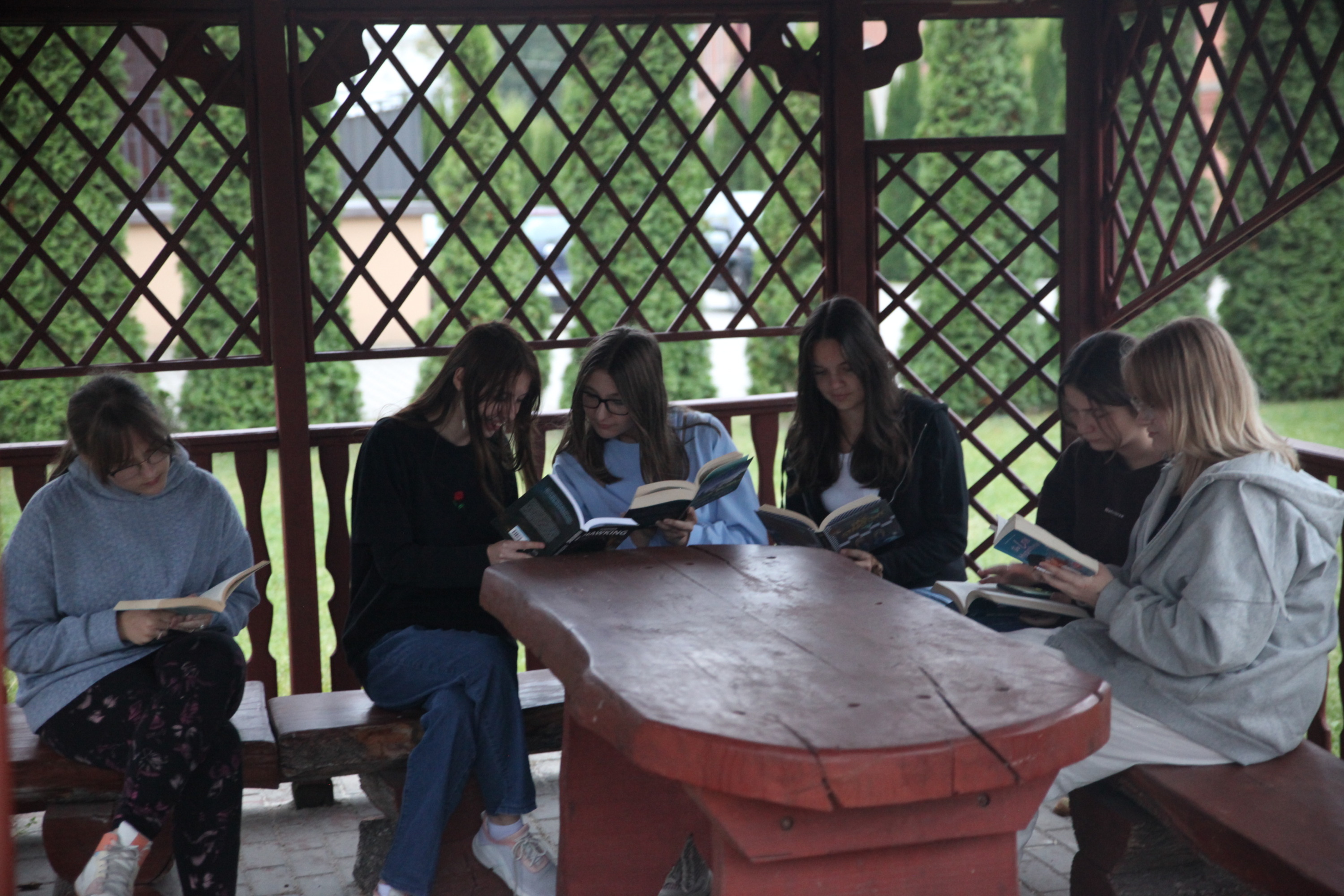 Uczniowie czytali w różnych miejscach na korytarzu, w salach, w internacie, a także w altance. Była to doskonała okazja do oderwania się od ekranów smartfonów i przeniesienia się w świat wyobraźni.