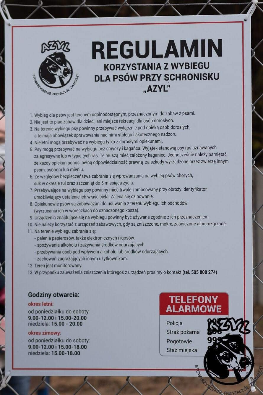 Wybieg przeznaczony jest zarówno dla czworonogów ze schroniska, jak i tych należących do mieszkańców miasta. Psy (z wyjątkiem ras uznawanych za agresywne) można wypuszczać w tym miejscu bez kagańca i smyczy. Na terenie obiektu znajdują się specjalne zabawki ruchowe, a także punkt rehabilitacji dla zwierząt po wypadkach. W okresie zimowym wybieg otwarty jest w godz. 9.00-12.00 i 15.00-18.00 od poniedziałku do soboty oraz w godz. 15.00-18.00 w niedzielę. Inwestycja została zrealizowana w ramach miejskiego budżetu obywatelskiego 2019.