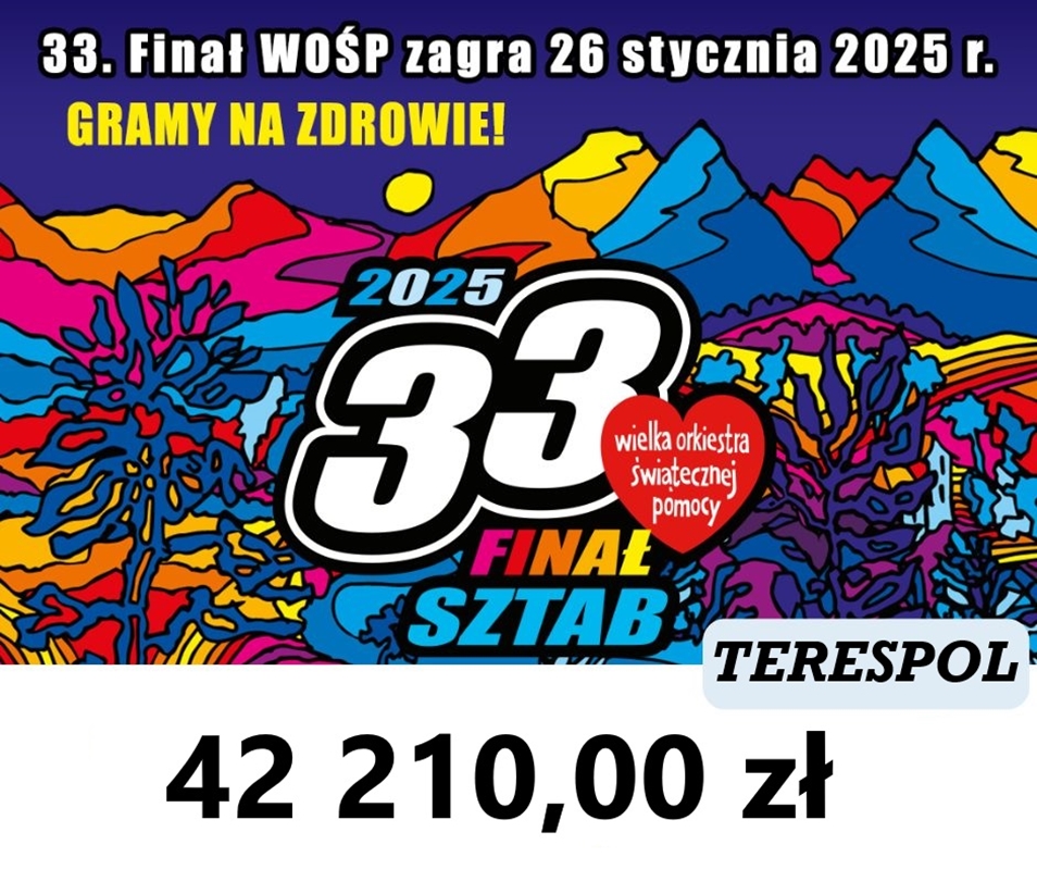 Terespolskiemu sztabowi WOŚP udało się w tym roku zebrać łącznie 42 210 zł (+ 2374 zł w e-Skarbonce – blisko 100 wpłat).i tym samym po raz kolejny nasz ubiegłoroczny rekord zostałpobity o ponad 10 tys. zł.