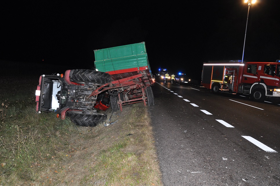 Po uderzeniu ciągnik zjechał do przydrożnego rowu. Pojazdem kierował 33-latek. Razem z nim podróżowała pasażerka, która w wyniku zdarzenia doznała obrażeń ciała. Do szpitala trafiły też dwie osoby podróżujące osobówką. Jak ustalili policjanci wykonujący czynności na miejscu zdarzenia kierujący pojazdami byli trzeźwi.