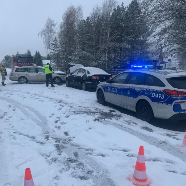 W Chotyłowie kierujący Fordem 36-latek stracił panowanie na śliskiej nawierzchni, zjechał na przeciwległy pas ruchu, gdzie zderzył się z Passatem. Po tym bocznie uderzył w Opla. Obrażeń ciała doznała pasażerka Passata.