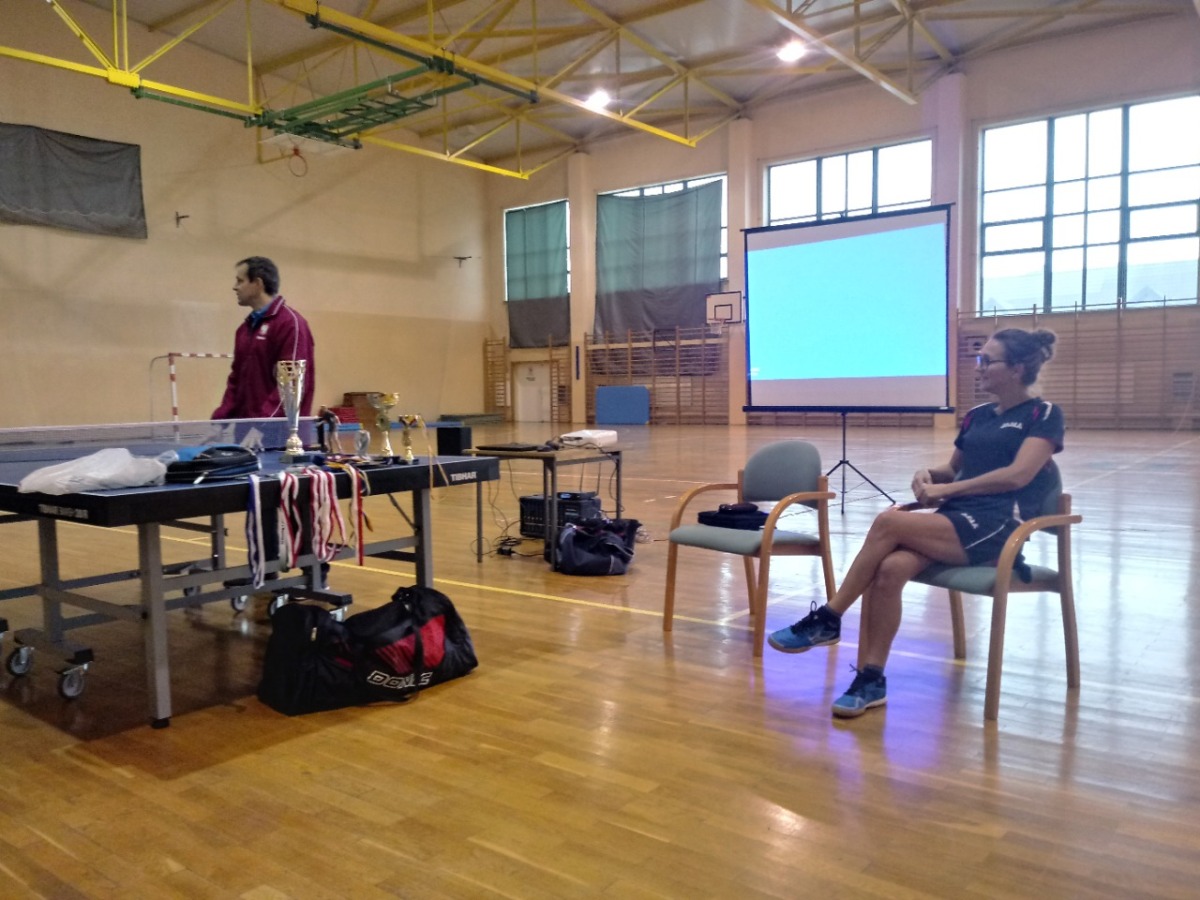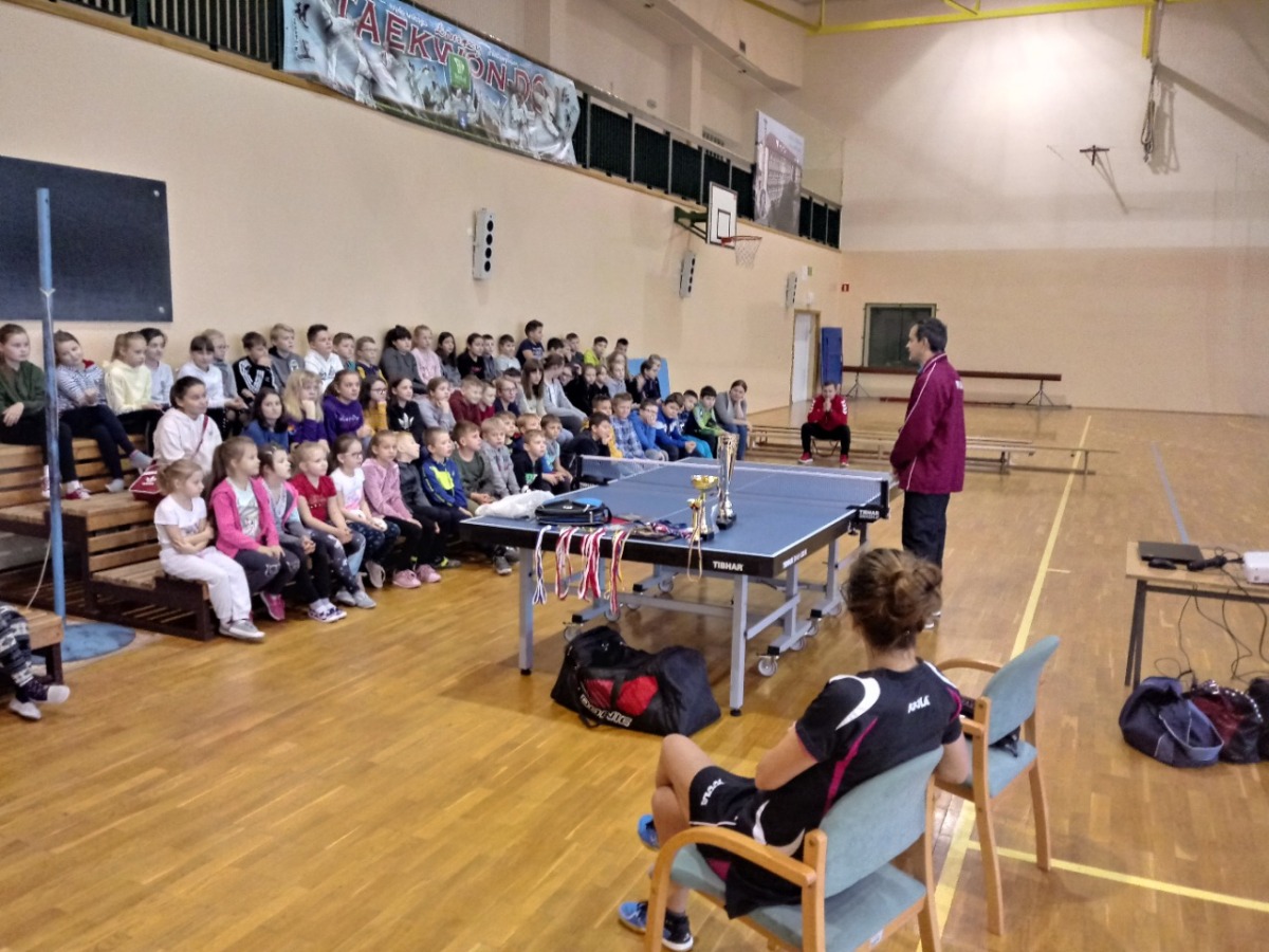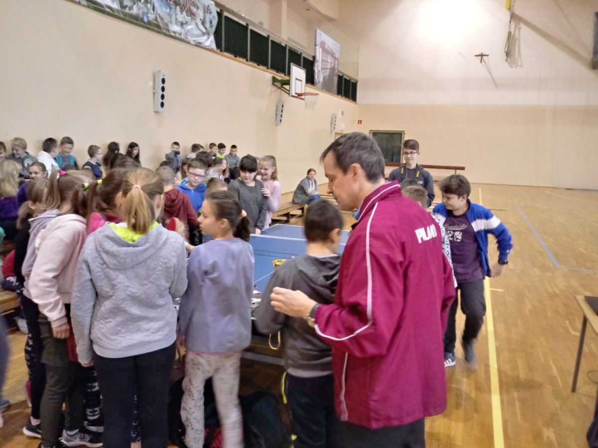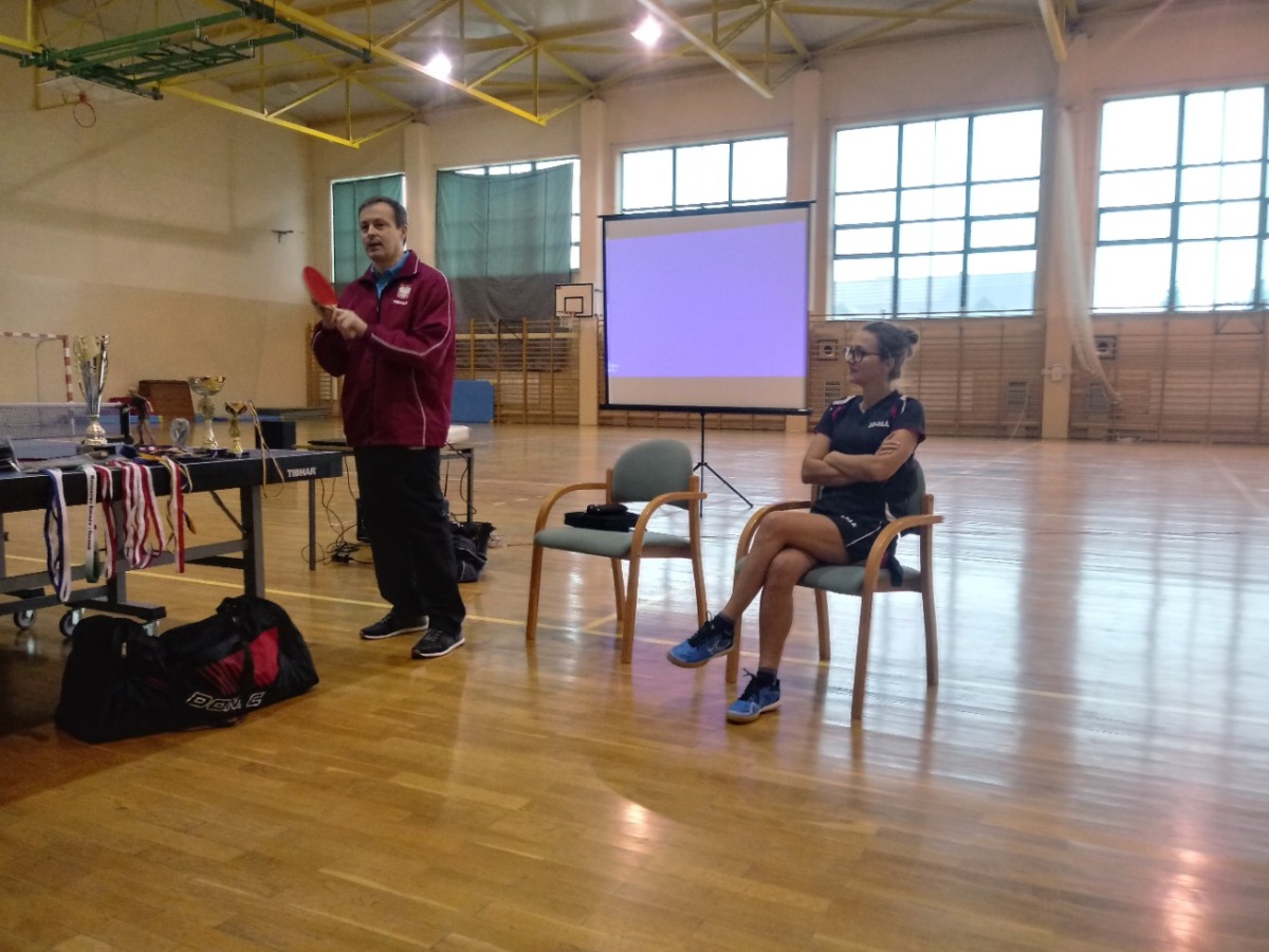 W pierwszej części Marian Wardzyński przedstawił różnice między ping-pongiem a tenisem stołowym, opowiedział o technice i sprzęcie w tenisie stołowym oraz zaprezentował swoje trofea z krajowych i zagranicznych turniejów. W drugiej części zawodnicy zaprezentowali jak to wszystko wygląda w praktyce. Po pokazowym treningu dzieci miały okazję spróbowania swoich sił przy stole razem z zaproszonymi gośćmi. Marian Wardzyński aktualnie gra w II lidze, a Ula Lewkowicz w IV lidze tenisa stołowego.