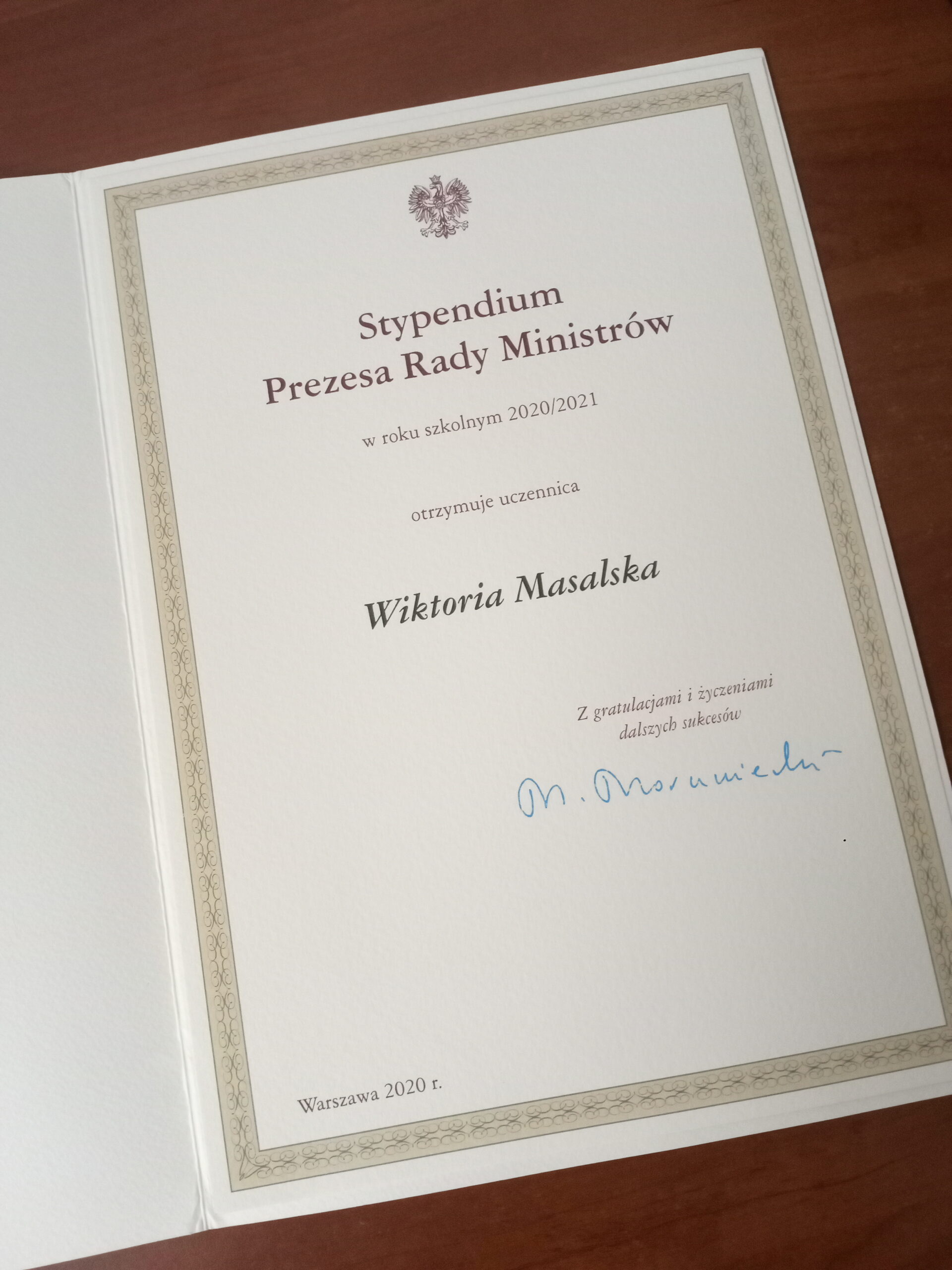Uczennica klasy IV Technikum w zawodzie technik żywienia i usług gastronomicznych w Zespole Szkół Centrum Kształcenia Rolniczego im. Wincentego Witosa w Leśnej Podlaskiej Wiktoria Masalska uzyskała Stypendium Prezesa Rady Ministrów w roku szkolnym 2020/2021.