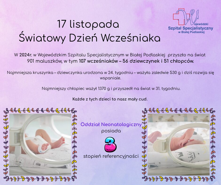 Co roku 17 listopada cały świat przypomina o sile wcześniaków i niezwykłej determinacji ich rodziców. Z tej okazji budynek Wojewódzkiego Szpitala Specjalistycznego w Białej Podlaskiej zostanie podświetlony na kolor fioletowy – barwę symbolizującą delikatność, wrażliwość, spokój i nadzieję.