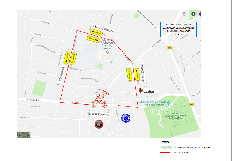 Realizowany będzie odcinek od ulicy Spółdzielczej do skrzyżowania z ulicą Kopernika i krzyżowanie ulicy Artyleryskiej z częściową ingerencja w ulicę Literacką. Prace będą wykonane etapami. Podczas robót, fragment ulicy będzie zamknięty od ul. Kopernika do ul. Artyleryjskiej (bez skrzyżowania), ul. Artyleryjska wraz ze skrzyżowaniem ul. Warszawskiej oraz jeden zjazd do supermarketu, ul. Warszawska, od drugiego zjazdu do supermarketu, włącznie do ul. Kusocińskiego, od ul. Kusocińskiego włącznie ze skrzyżowaniem do ul. Spółdzielczej włącznie ze skrzyżowaniem, od ul. Spółdzielczej do Warszawskiej 11.
