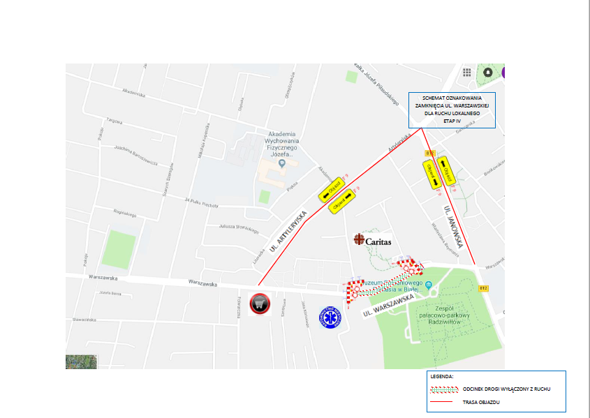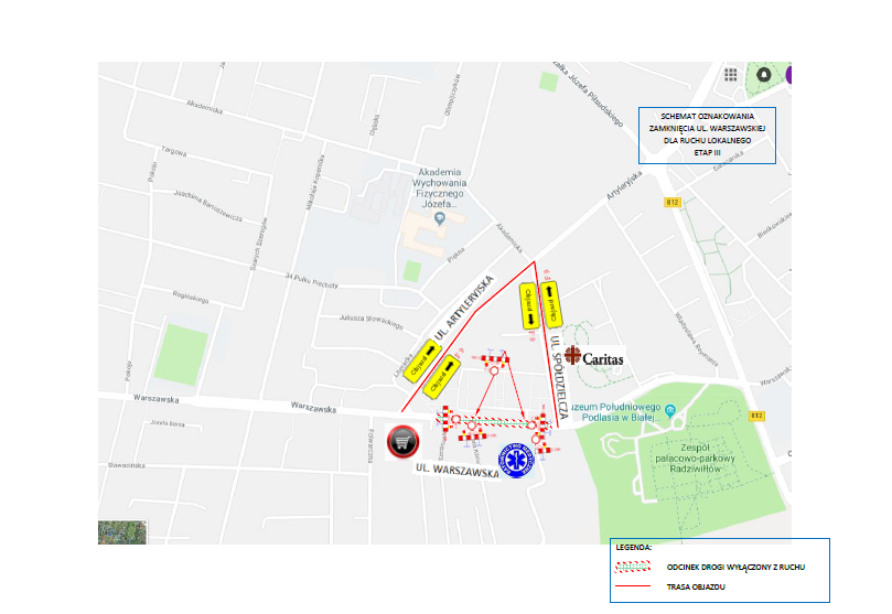 Realizowany będzie odcinek od ulicy Spółdzielczej do skrzyżowania z ulicą Kopernika i krzyżowanie ulicy Artyleryskiej z częściową ingerencja w ulicę Literacką. Prace będą wykonane etapami. Podczas robót, fragment ulicy będzie zamknięty od ul. Kopernika do ul. Artyleryjskiej (bez skrzyżowania), ul. Artyleryjska wraz ze skrzyżowaniem ul. Warszawskiej oraz jeden zjazd do supermarketu, ul. Warszawska, od drugiego zjazdu do supermarketu, włącznie do ul. Kusocińskiego, od ul. Kusocińskiego włącznie ze skrzyżowaniem do ul. Spółdzielczej włącznie ze skrzyżowaniem, od ul. Spółdzielczej do Warszawskiej 11.