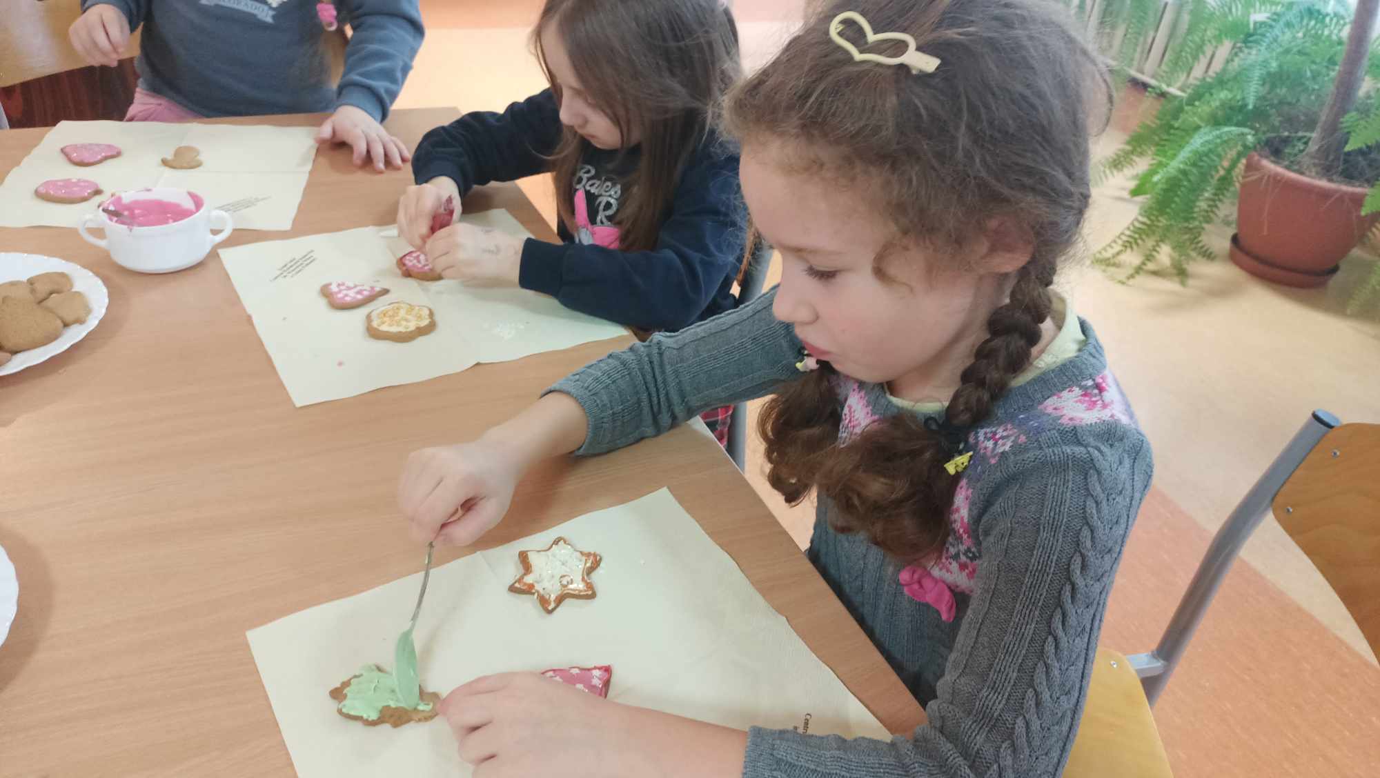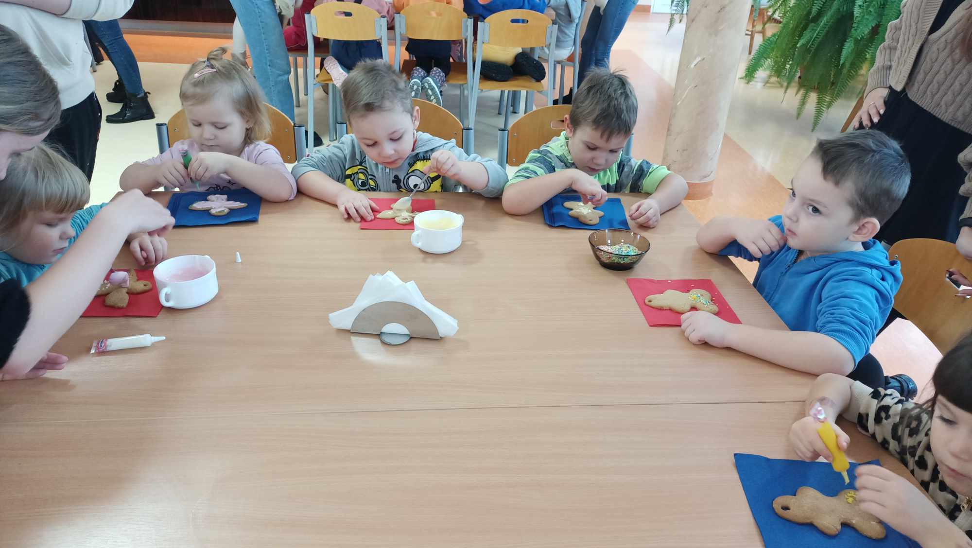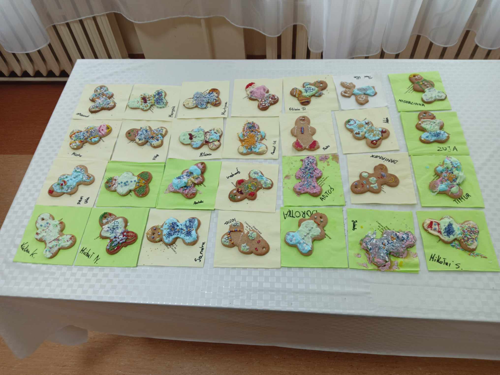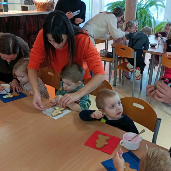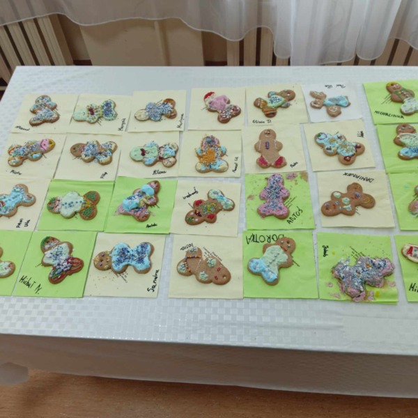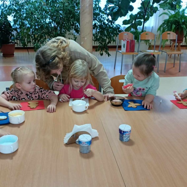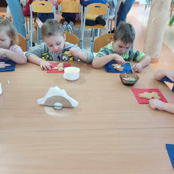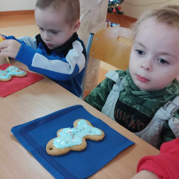 Spotkanie rozpoczęło się pogadanką na temat zastosowania ciasta piernikowego oraz tradycji bożonarodzeniowych. Następnie dzieci ozdabiały ciastka według własnych pomysłów, używając do tego kolorowej polewy i różnego rodzaju posypki. Wszyscy dołożyli wszelkich starań, by ich dzieła prezentowały się jak najpiękniej. Na koniec najmłodszych odwiedził Św. Mikołaj, który obejrzał udekorowane wypieki i oraz wysłuchał wierszy oraz piosenek przygotowanych przez dzieci.