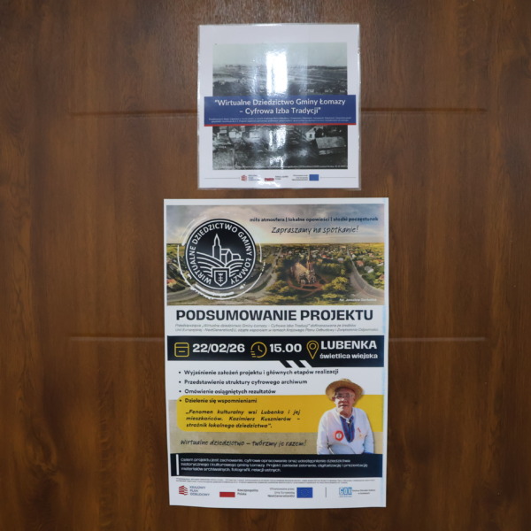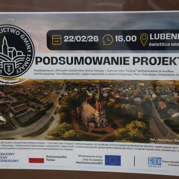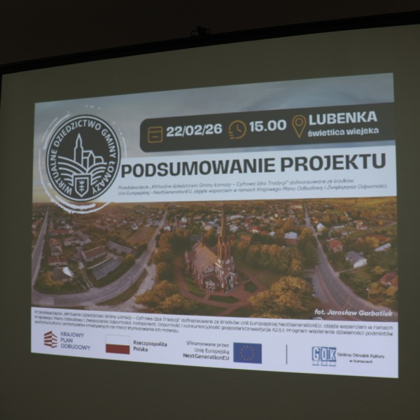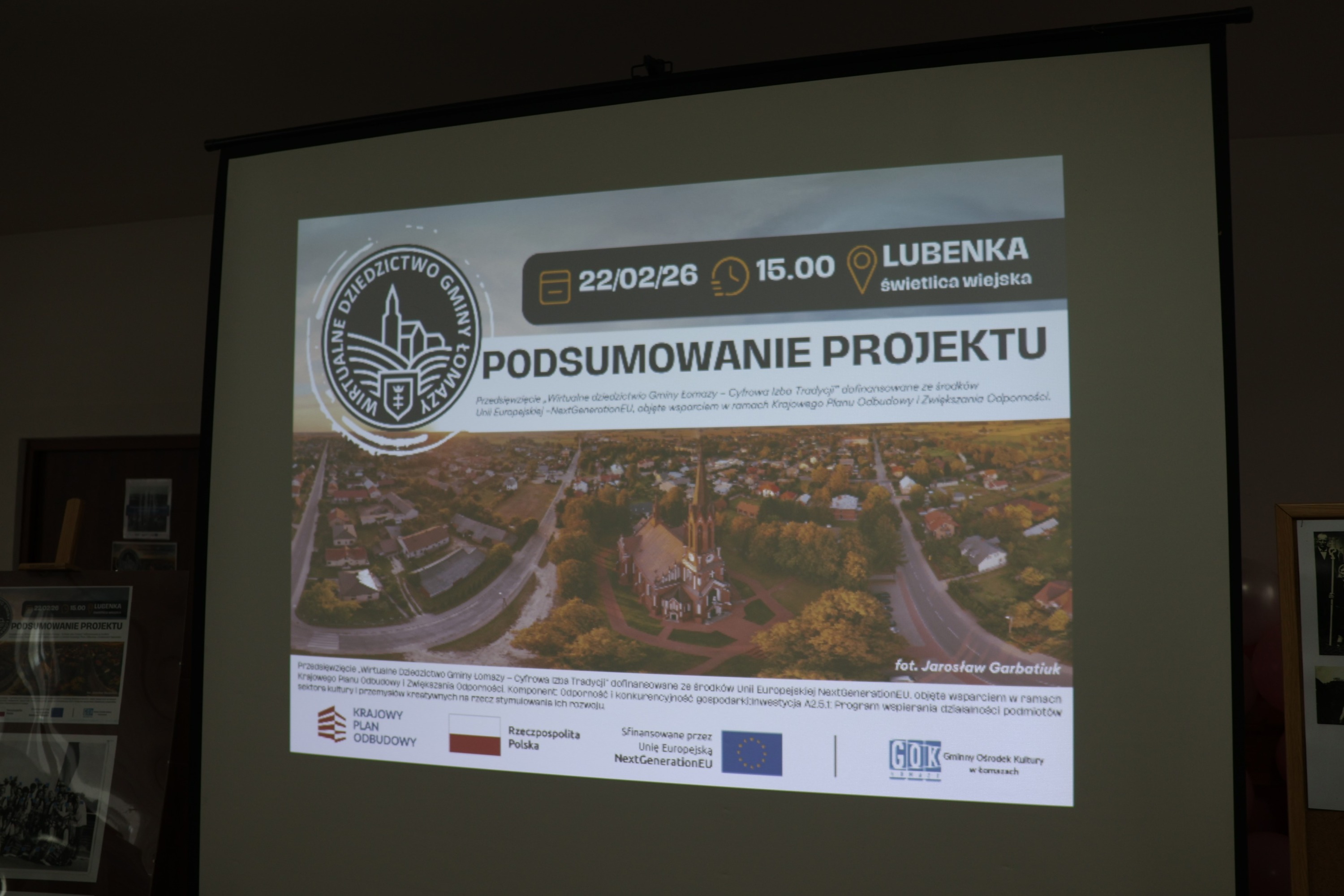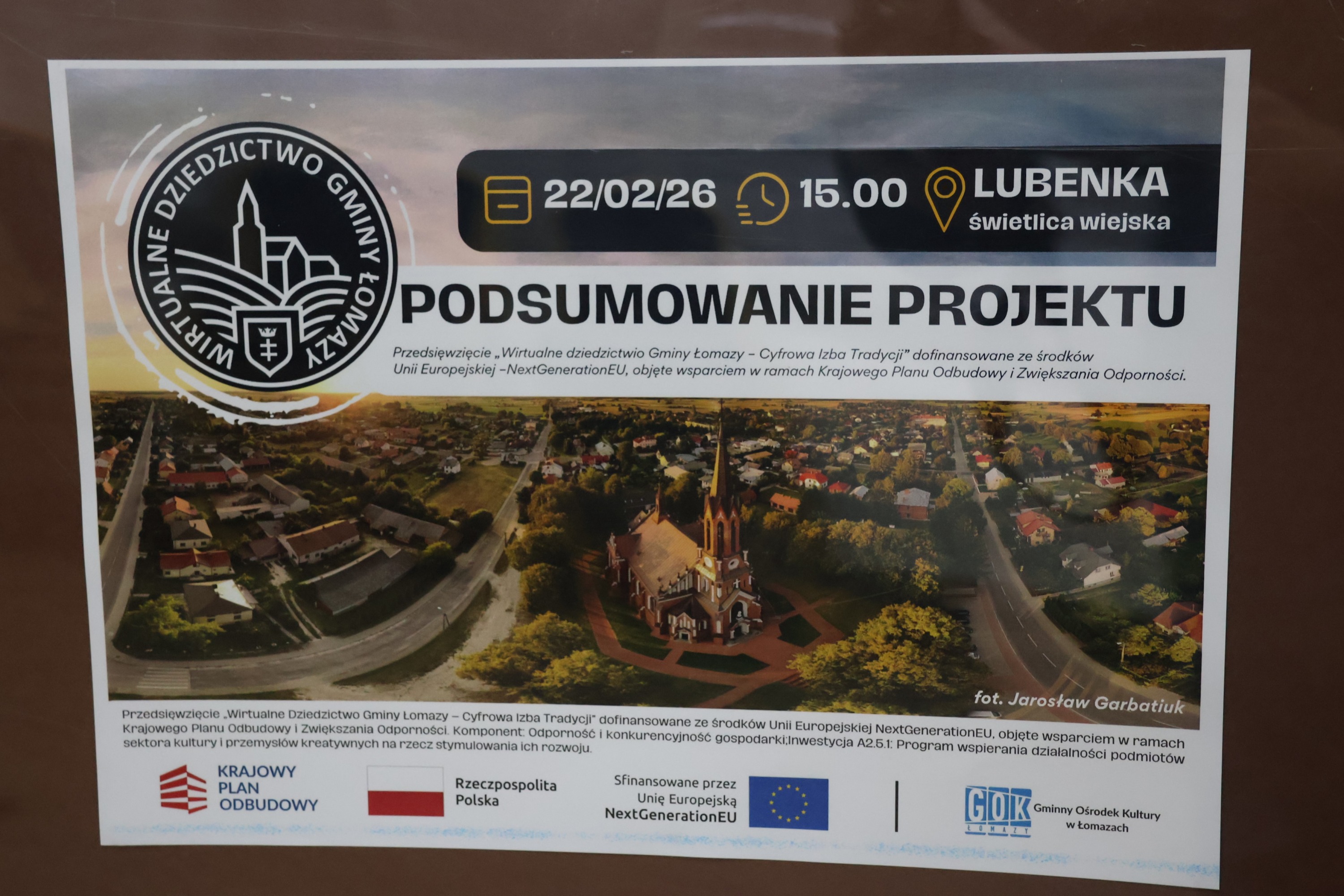22 lutego 2026 r. w świetlicy wiejskiej w Lubence odbyło się spotkanie podsumowujące przedsięwzięcie realizowane przez Gminny Ośrodek Kultury w Łomazach pn. „Wirtualne Dziedzictwo Gminy Łomazy – Cyfrowa Izba Tradycji”. Projekt dofinansowany ze środków Unii Europejskiej – NextGenerationEU, w ramach Krajowego Planu Odbudowy i Zwiększania Odporności. Komponent: Odporność i konkurencyjność gospodarki; Inwestycja A2.5.1: Program wspierania działalności podmiotów sektora kultury i przemysłów kreatywnych na rzecz stymulowania ich rozwoju.