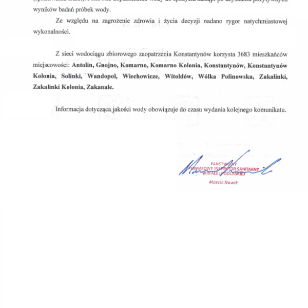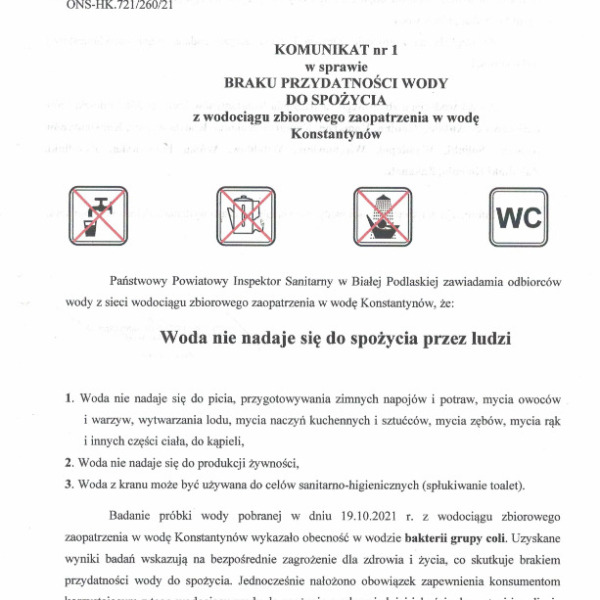 Państwowy Powiatowy Inspektor Sanitarny w Białej Podlaskiej informuje o braku przydatności wody do spożycia z wodociągu zbiorowego zaopatrzenia w wodę Konstantynów.