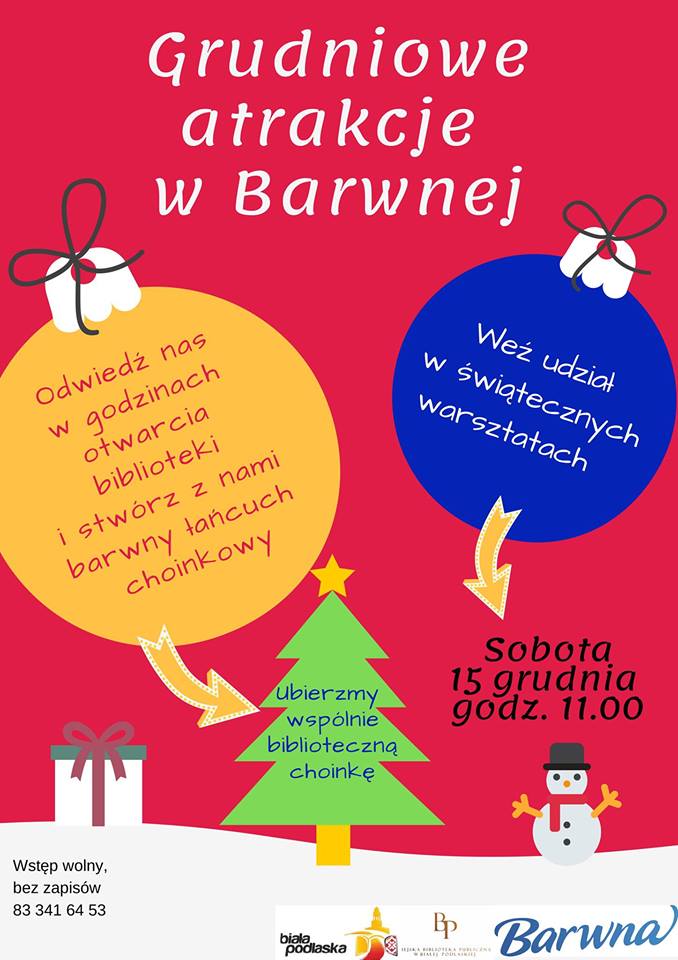 Barwna Multimedialna Biblioteka dla Dzieci i Młodzieży zaprasza wszystkie dzieci wraz z rodzicami do wzięcia udziału w świątecznych warsztatach, które odbędą się w sobotę (15 grudnia) o godzinie 11 w Bibliotece Barwnej przy ul. Warszawskiej 12c.