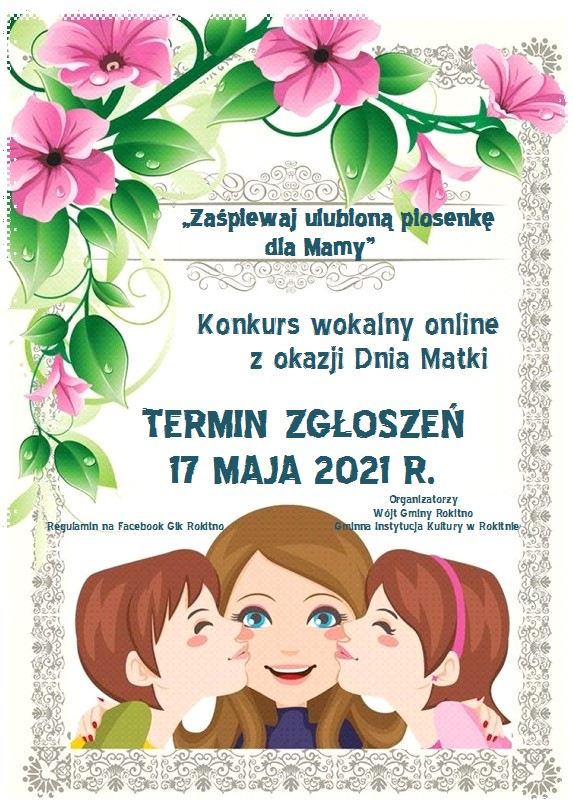 Wójt i Gminna Instytucja Kultury w Rokitnie zapraszają do udziału w konkursie wokalnym “Zaśpiewaj ulubioną piosenkę dla Mamy”. Piosenki śpiewane przez uczestników są dedykowane dla mam z okazji ich święta. Zgłoszenia trwają do 17 maja.