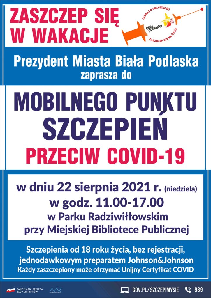 22 sierpnia w zespole pałacowo-parkowym Radziwiłłów, odbędzie się akcja szczepień przeciwko COVID-19. Mobilny punkt szczepień będzie otwarty od 11:00 do 17:00 obok Miejskiej Biblioteki Publicznej. Chętni, bez uprzedniej rejestracji, mogą zaszczepić się jednodawkowym preparatem Johnson&Johnson.