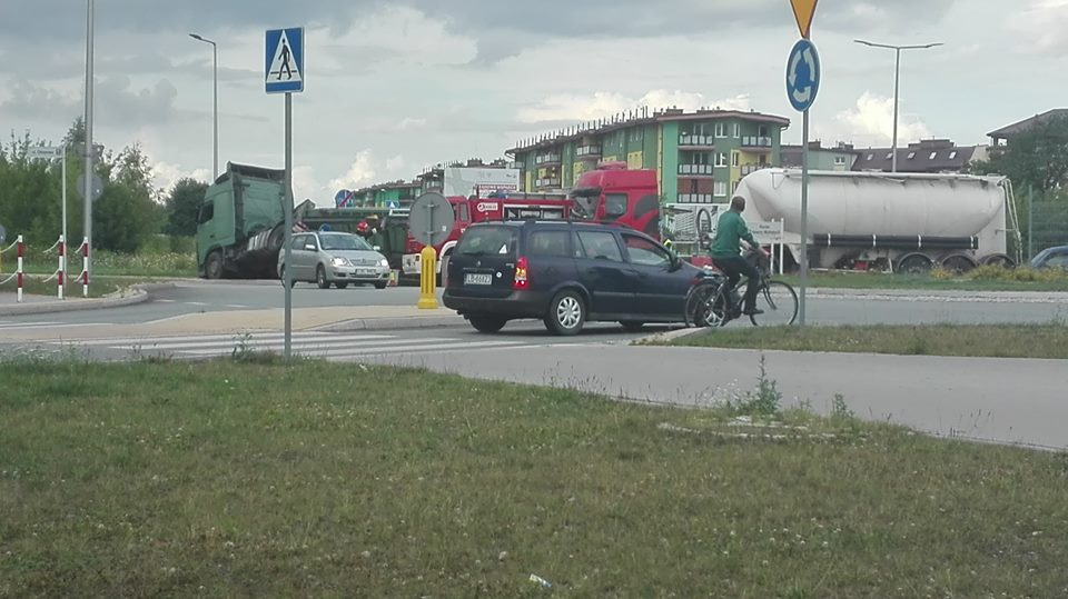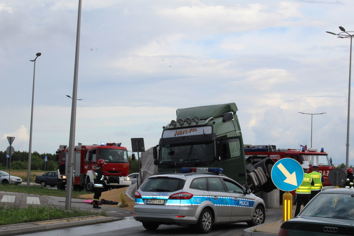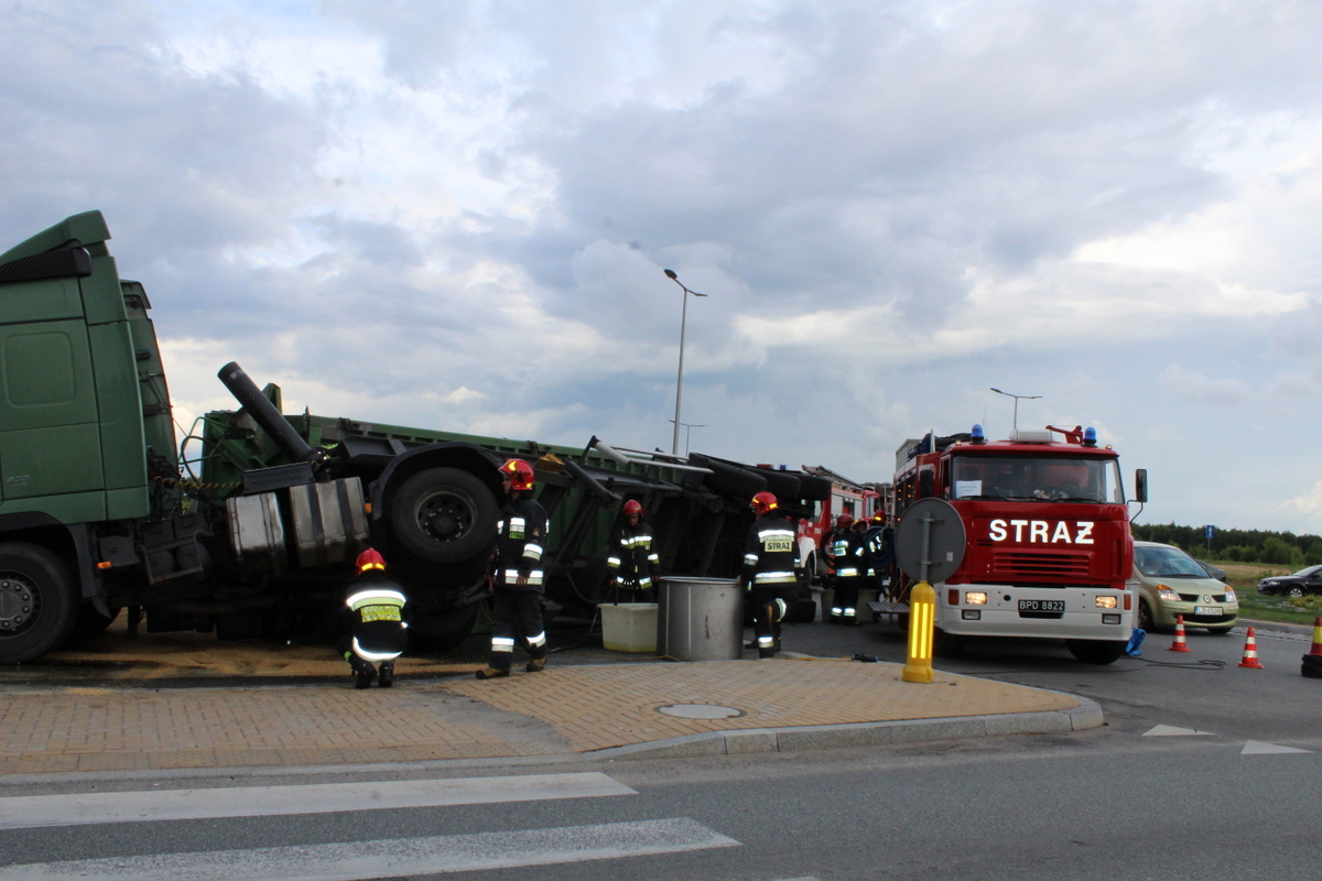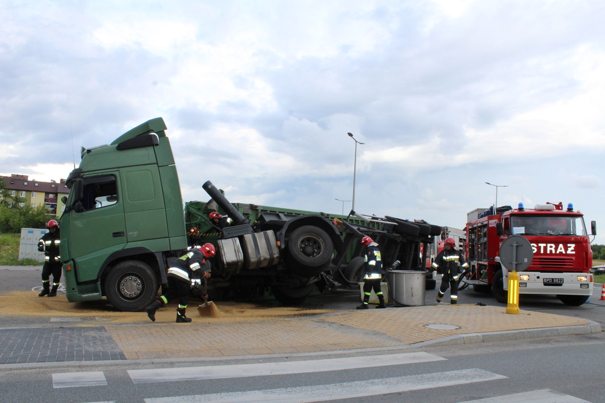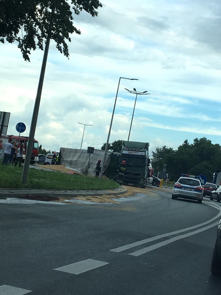 Tuż po godzinie 17 w poniedziałek (16 lipca) na rondzie na ulicy Janowskiej z nieustalonych jeszcze przyczyn przewrócił się samochód ciężarowy. Kierowca w naczepie przewoził zboże, które wysypało się na dużą część chodnika.