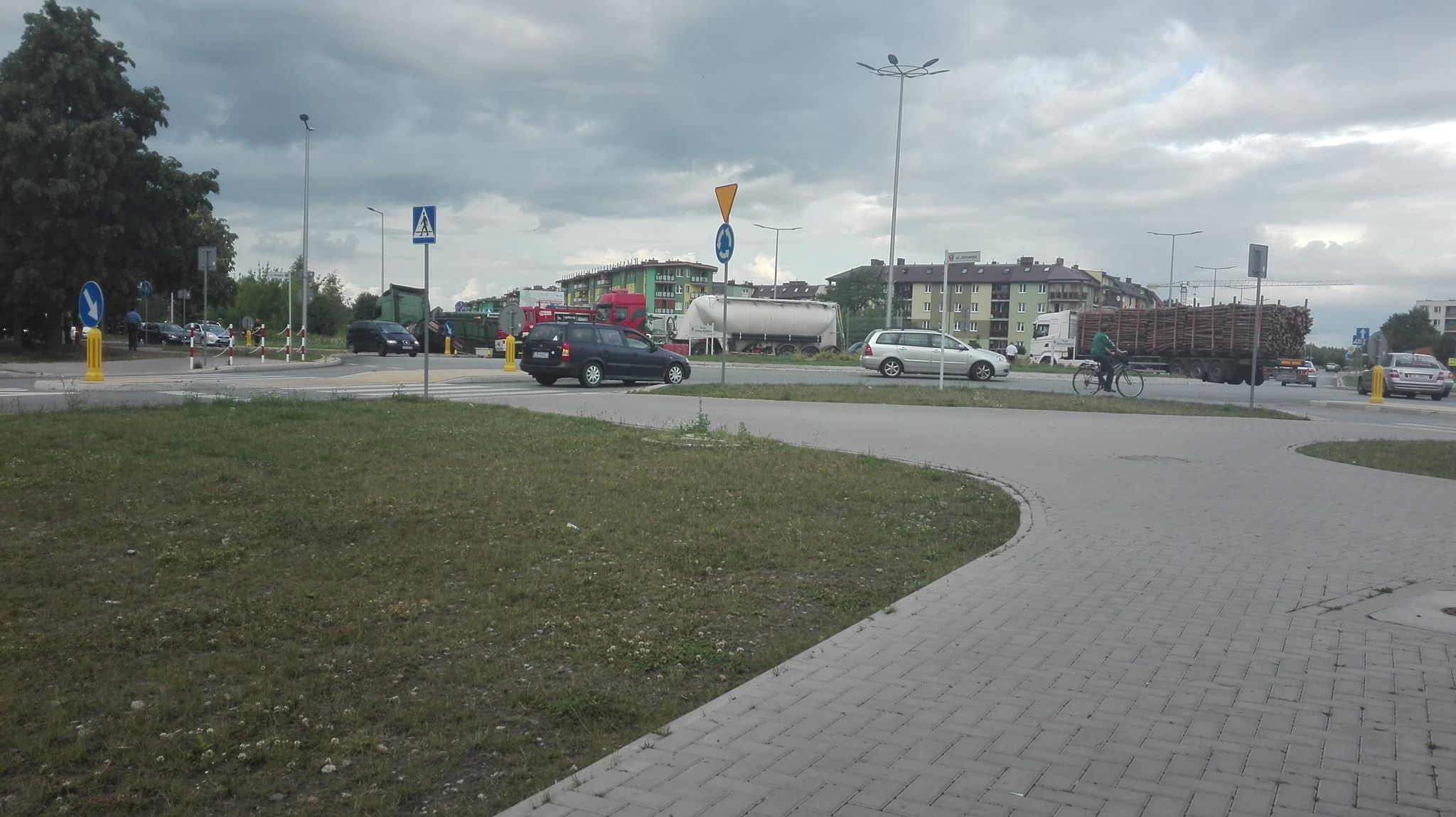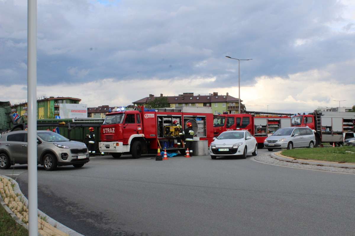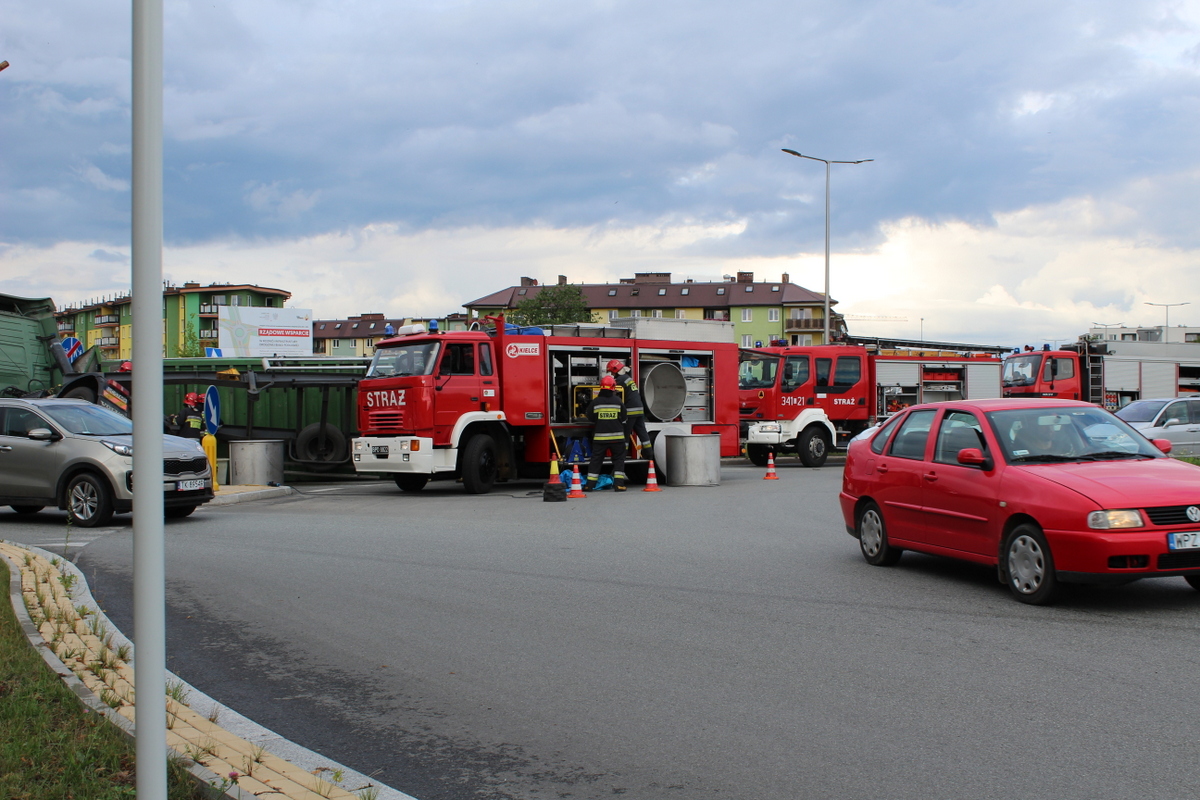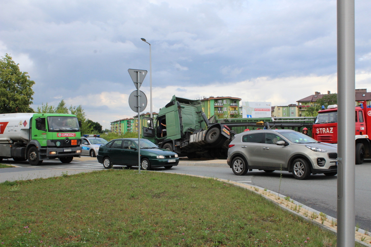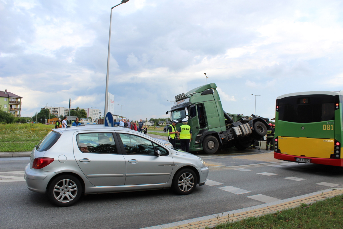 Tuż po godzinie 17 w poniedziałek (16 lipca) na rondzie na ulicy Janowskiej z nieustalonych jeszcze przyczyn przewrócił się samochód ciężarowy. Kierowca w naczepie przewoził zboże, które wysypało się na dużą część chodnika.