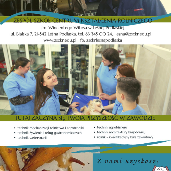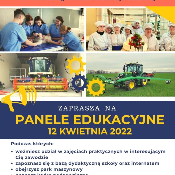 Dyrektor Zespołu Szkół Centrum Kształcenia Rolniczego im. Wincentego Witosa w Leśnej Podlaskiej serdecznie zaprasza uczniów Szkół Podstawowych wraz z nauczycielami na Panele Edukacyjne, które odbędą się w dniu 12 kwietnia 2022 r. Początek wydarzenia – godz. 8.30.
