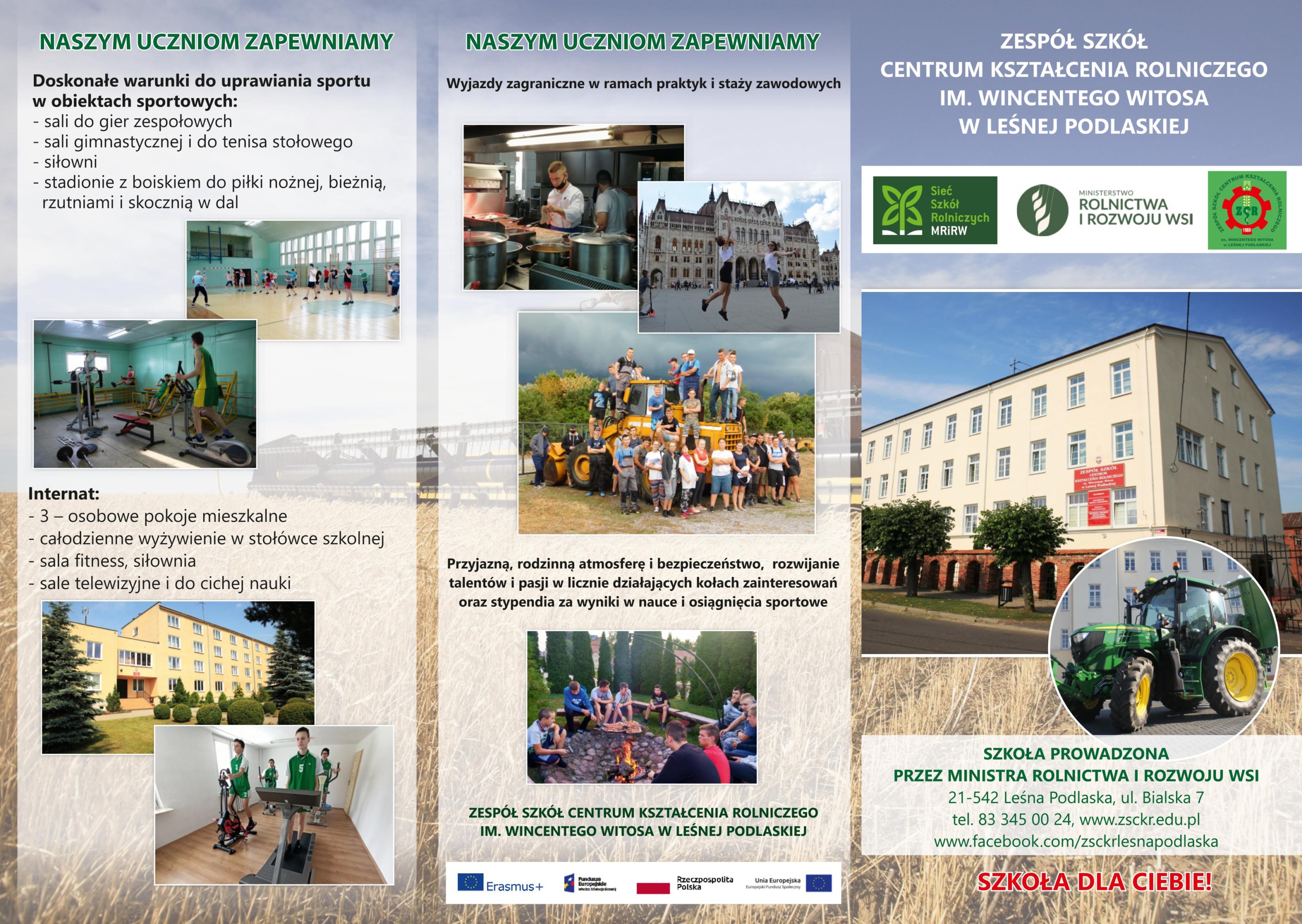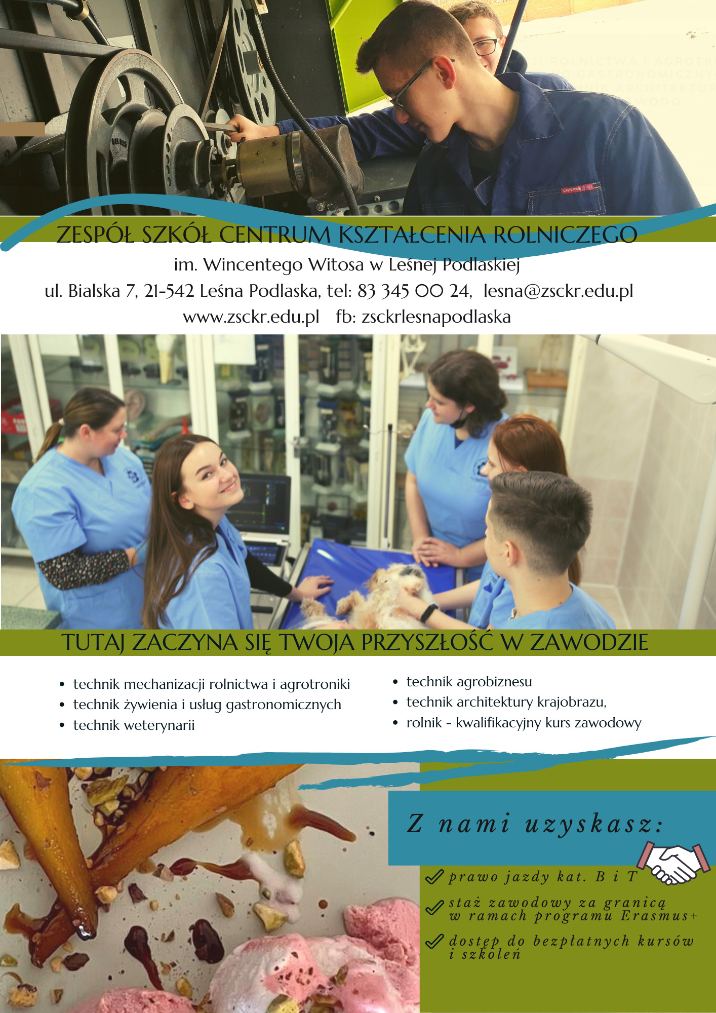 Dyrektor Zespołu Szkół Centrum Kształcenia Rolniczego im. Wincentego Witosa w Leśnej Podlaskiej serdecznie zaprasza uczniów Szkół Podstawowych wraz z nauczycielami na Panele Edukacyjne, które odbędą się w dniu 12 kwietnia 2022 r. Początek wydarzenia – godz. 8.30.